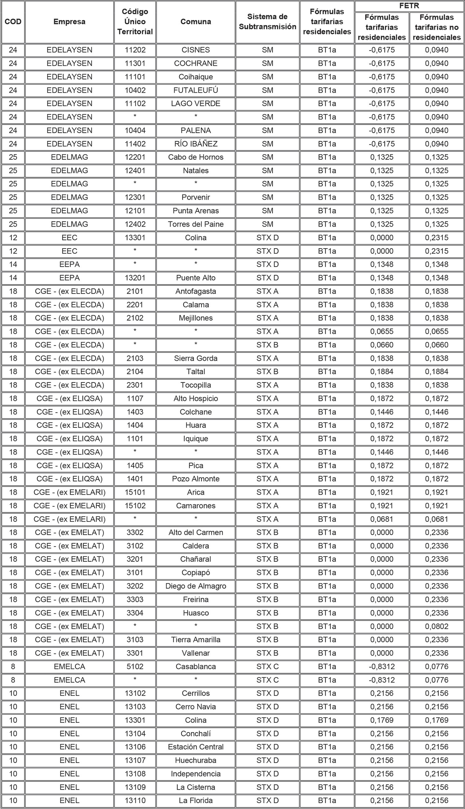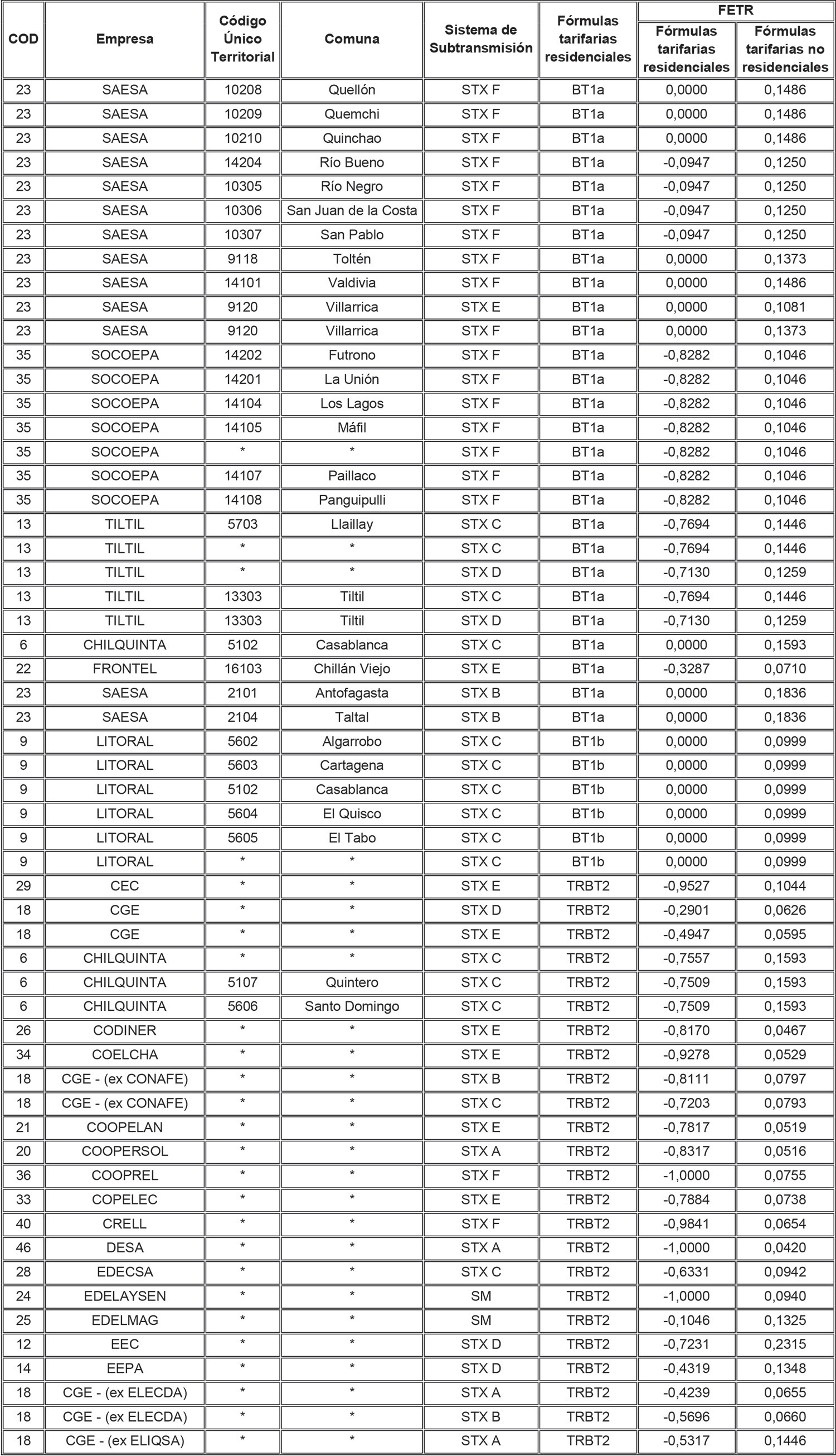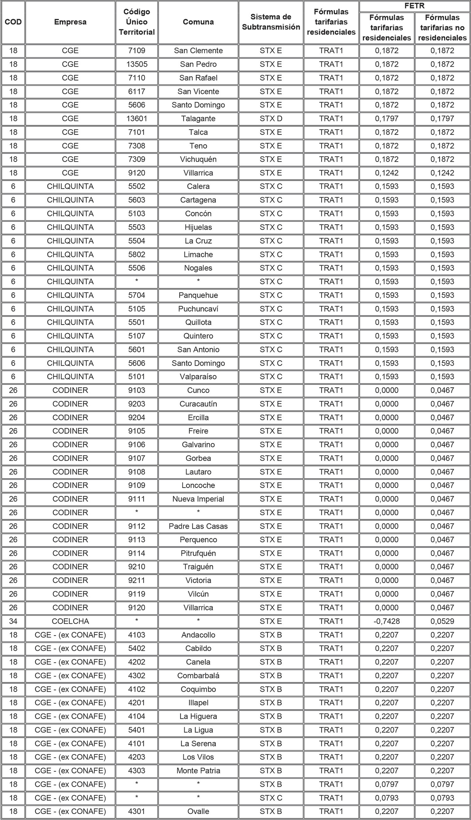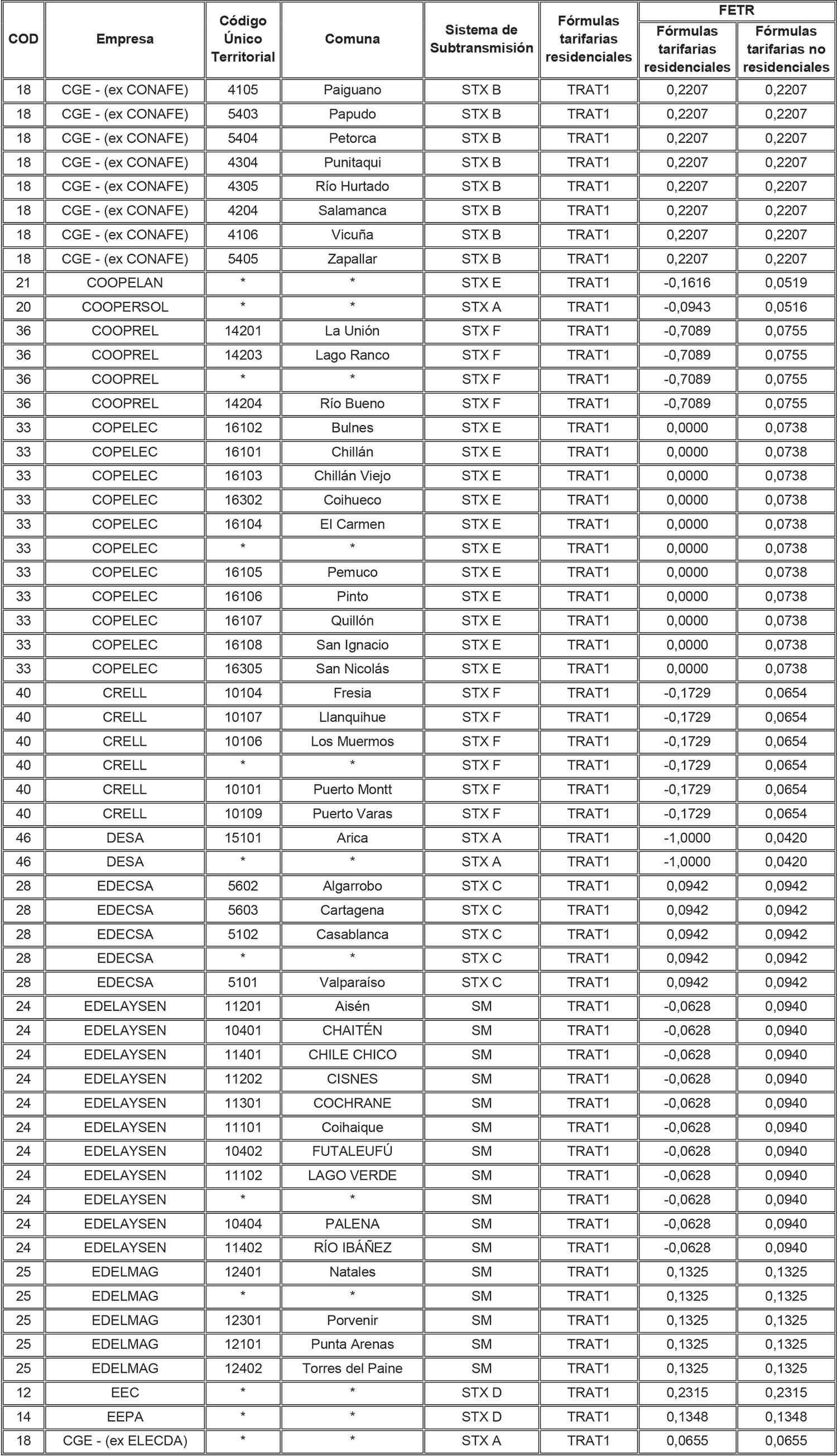 Para aquellas combinaciones empresa/comuna/sistema de transmisión zonal que no tienen asignado en la tabla anterior un FETR para alguna de las tarifas residenciales, se deberá aplicar el FETR determinado para la combinación empresa/sistema de transmisión zonal/tarifa, determinado para aquellas comunas no individualizadas (es decir, que presentan un * en la columna Comuna de la tabla anterior).