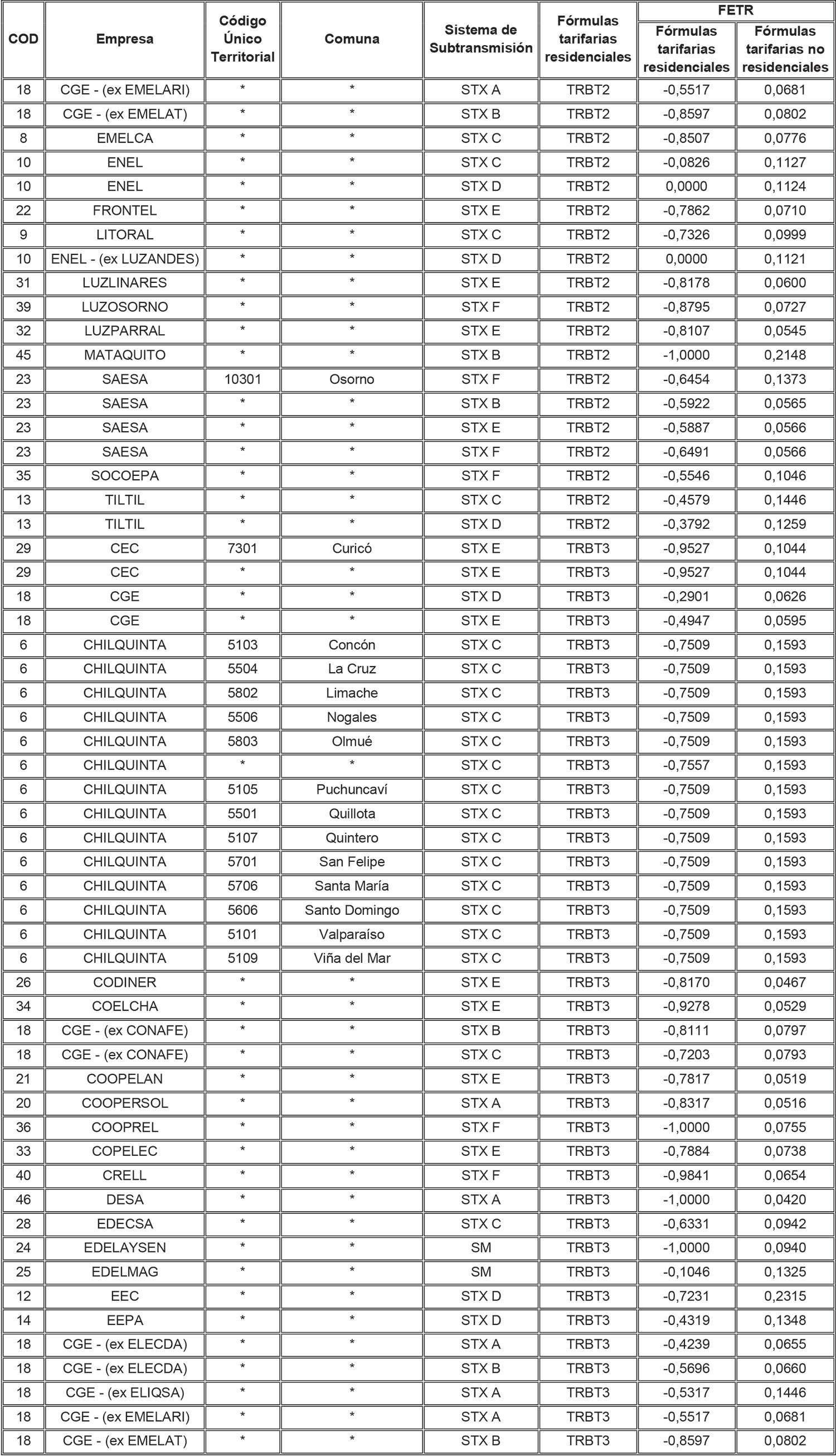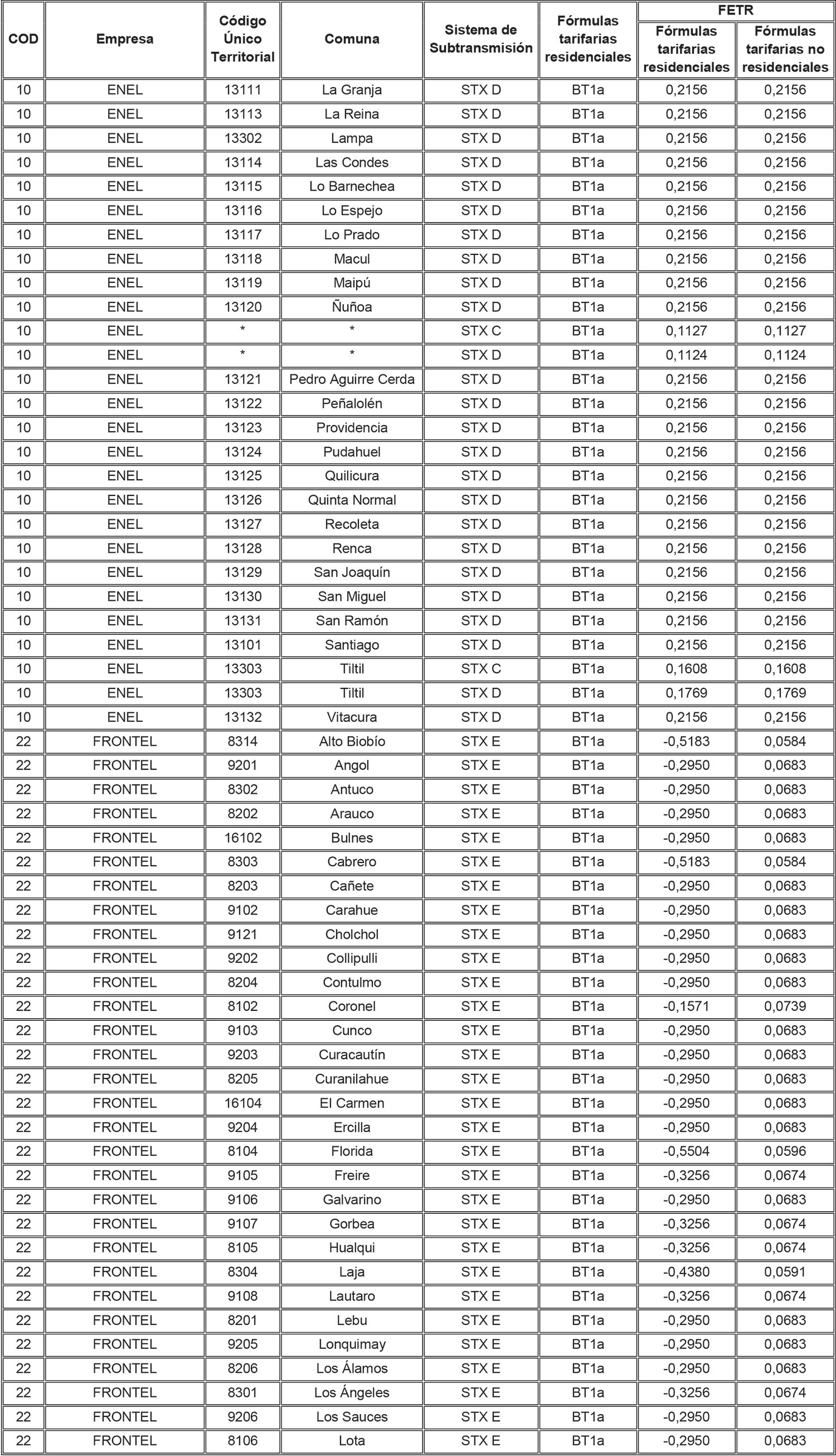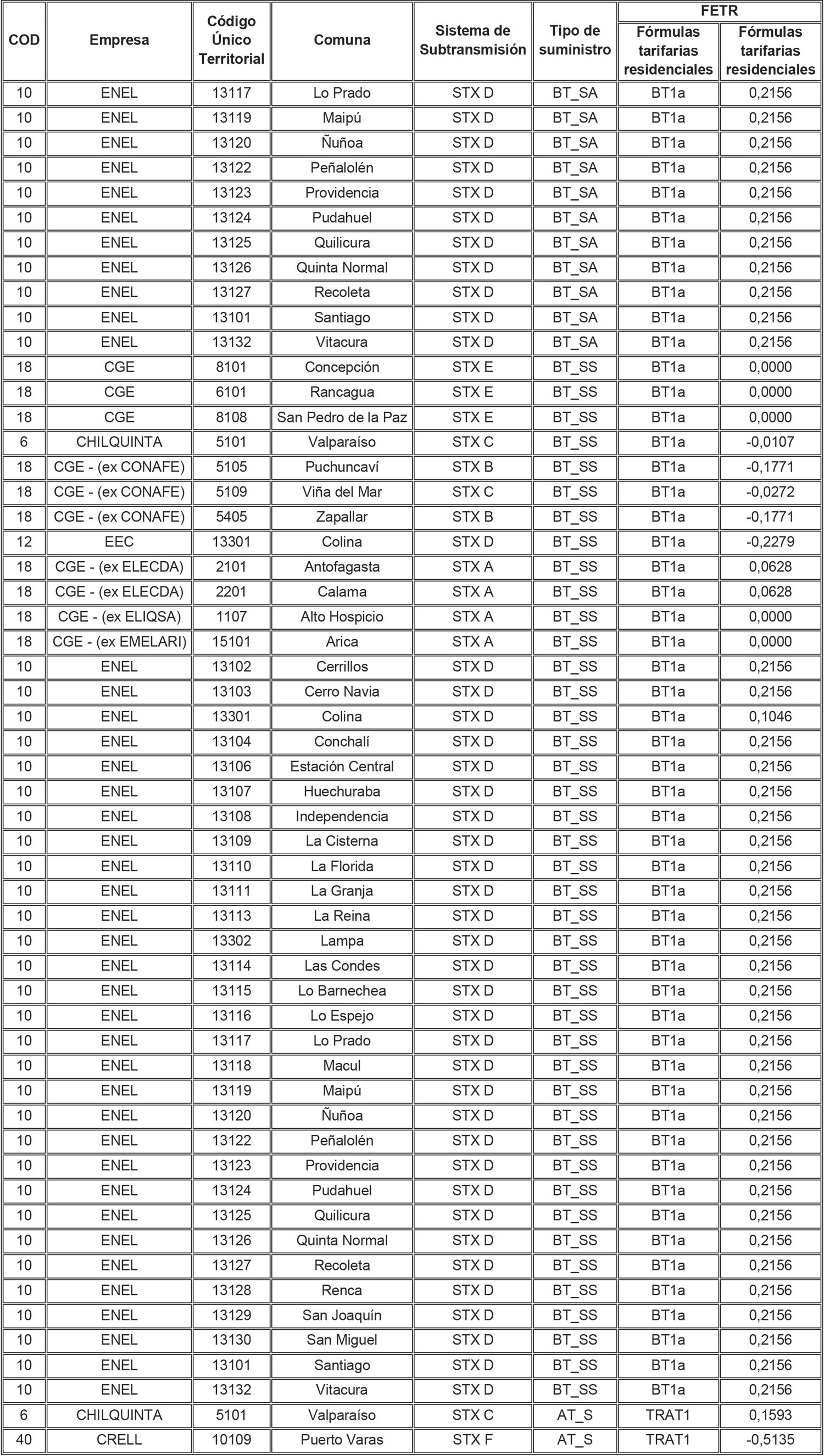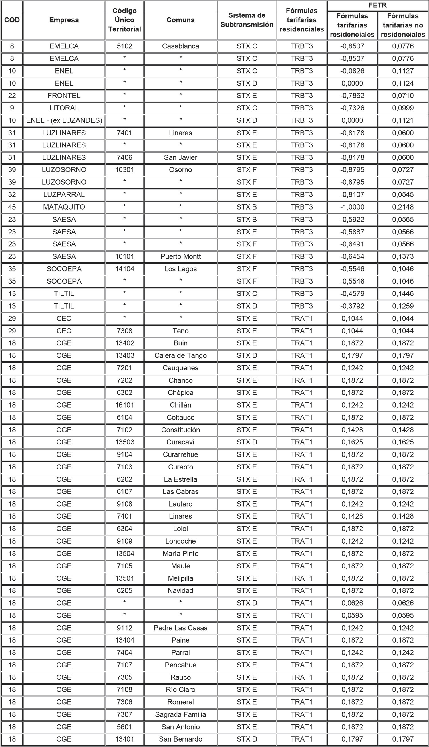 Para aquellas combinaciones empresa/comuna/sistema de transmisión zonal que no tienen asignado en la tabla anterior un FETR para alguna de las tarifas residenciales, se deberá aplicar el FETR determinado para la combinación empresa/sistema de transmisión zonal/tarifa, determinado para aquellas comunas no individualizadas (es decir, que presentan un * en la columna Comuna de la tabla anterior).
