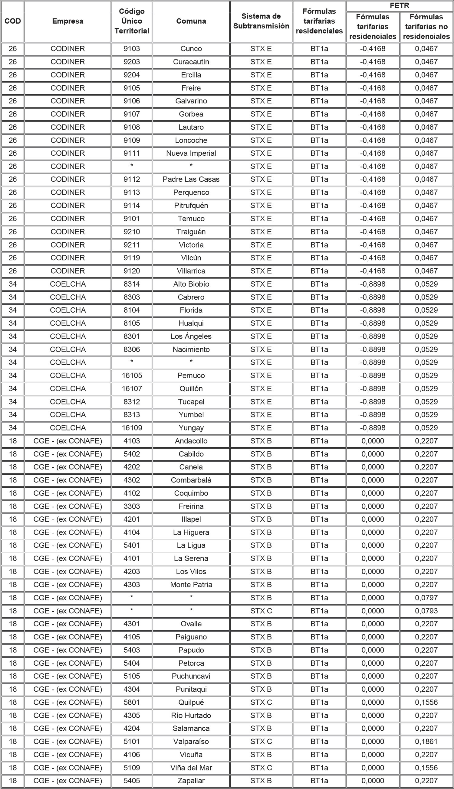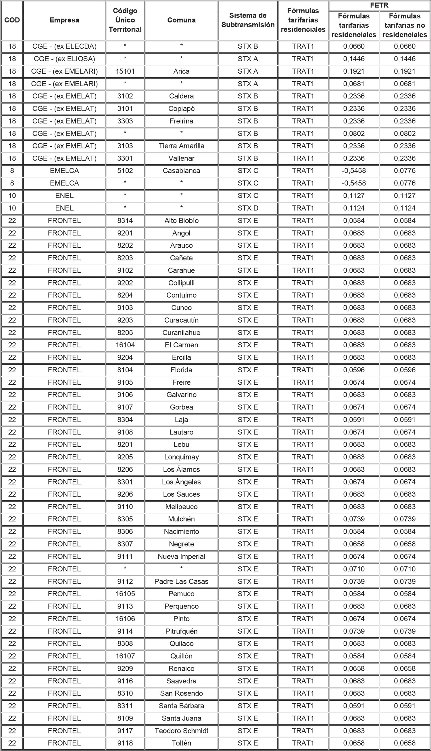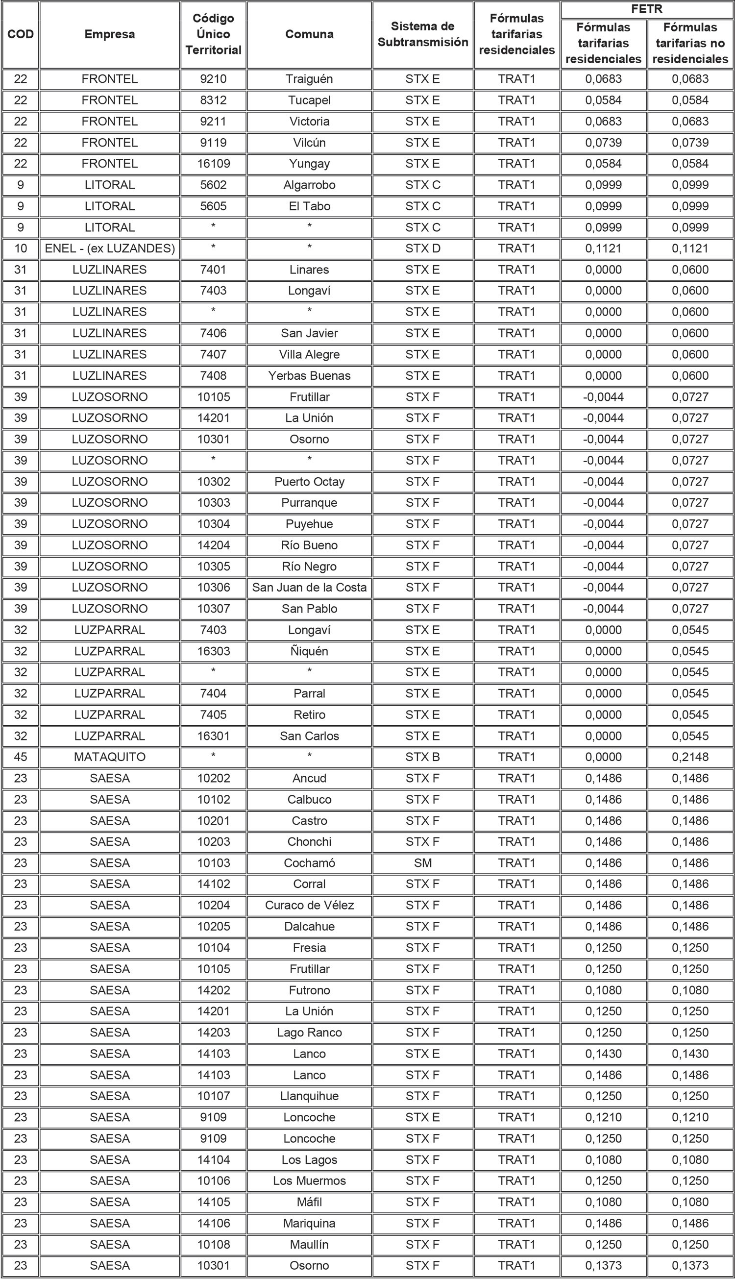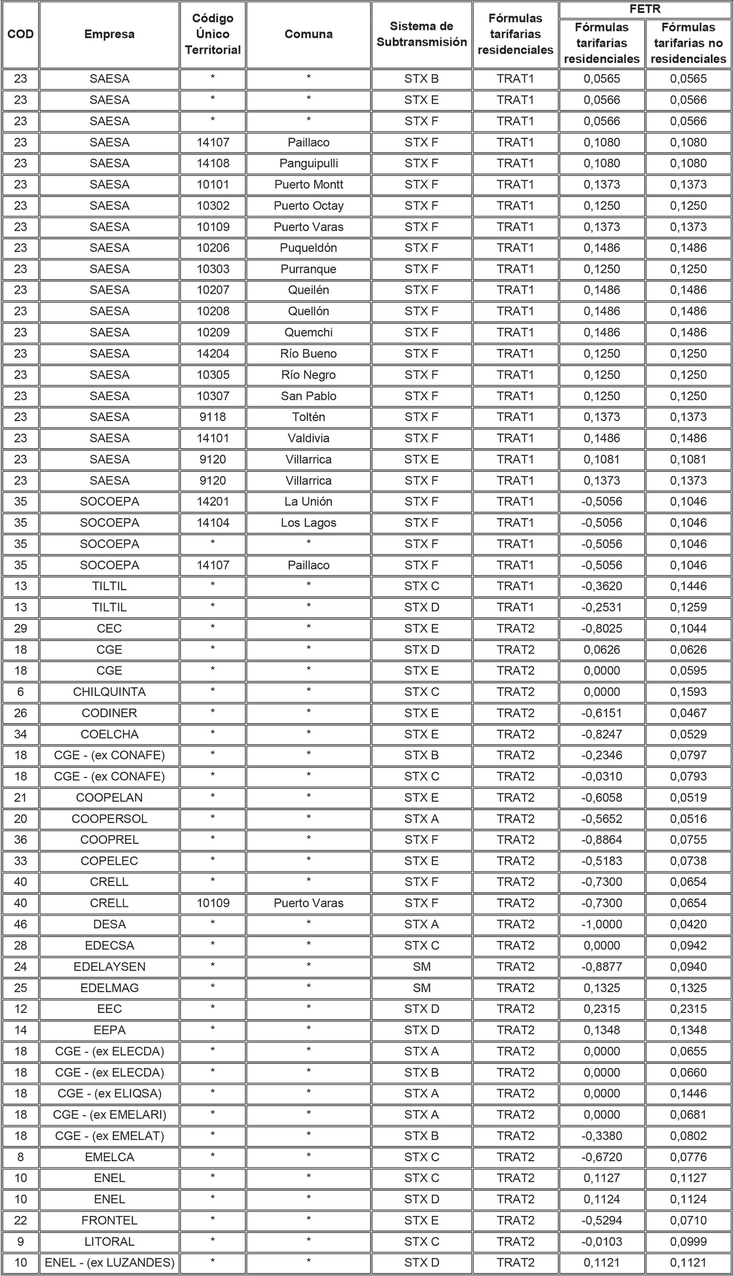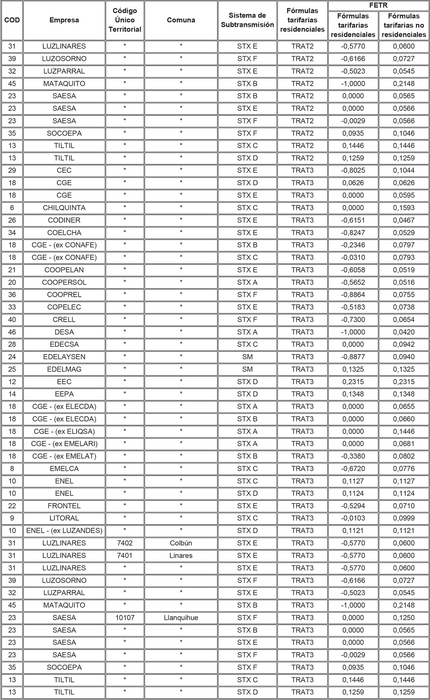 Para aquellas combinaciones empresa/comuna/sistema de transmisión zonal que no tienen asignado en la tabla anterior un FETR para alguna de las tarifas residenciales, se deberá aplicar el FETR determinado para la combinación empresa/sistema de transmisión zonal/tarifa, determinado para aquellas comunas no individualizadas (es decir, que presentan un * en la columna Comuna de la tabla anterior).