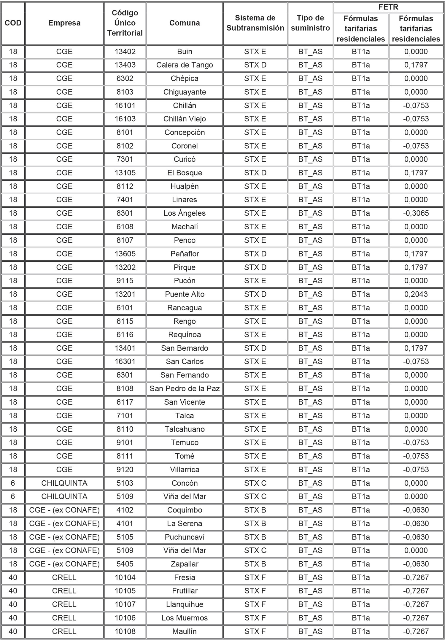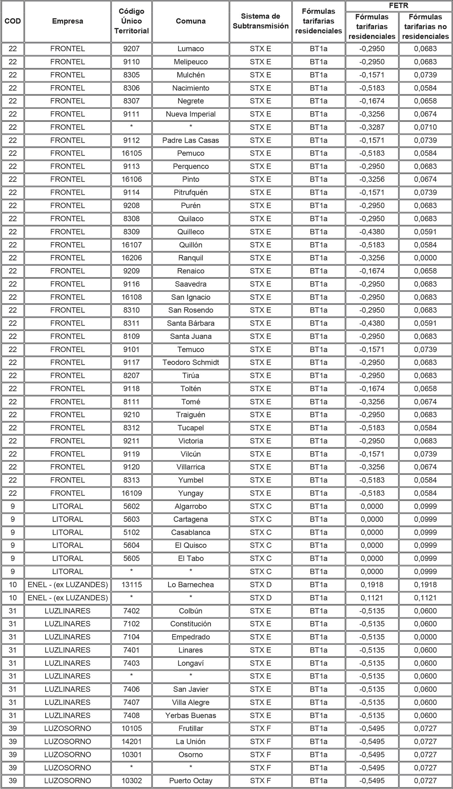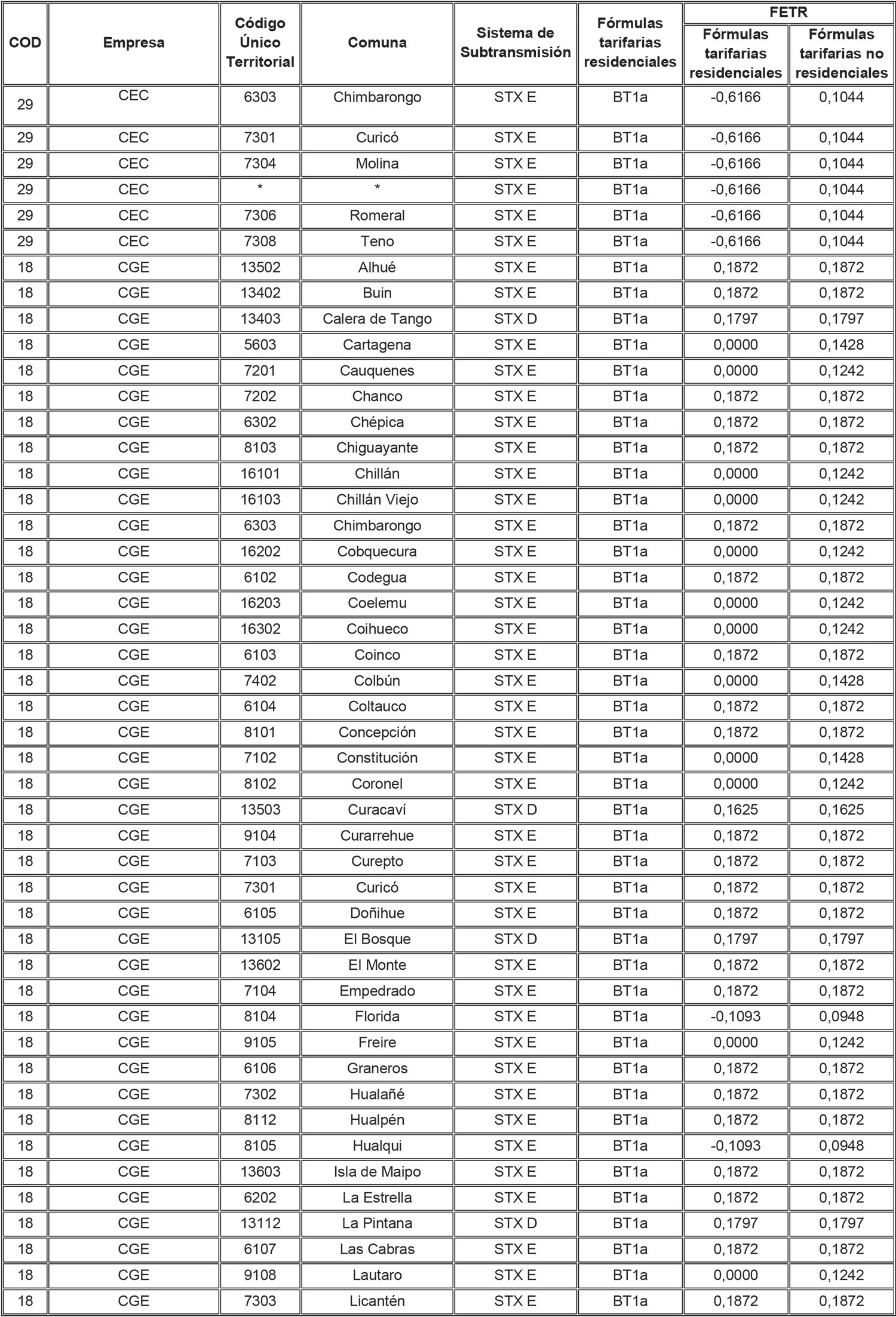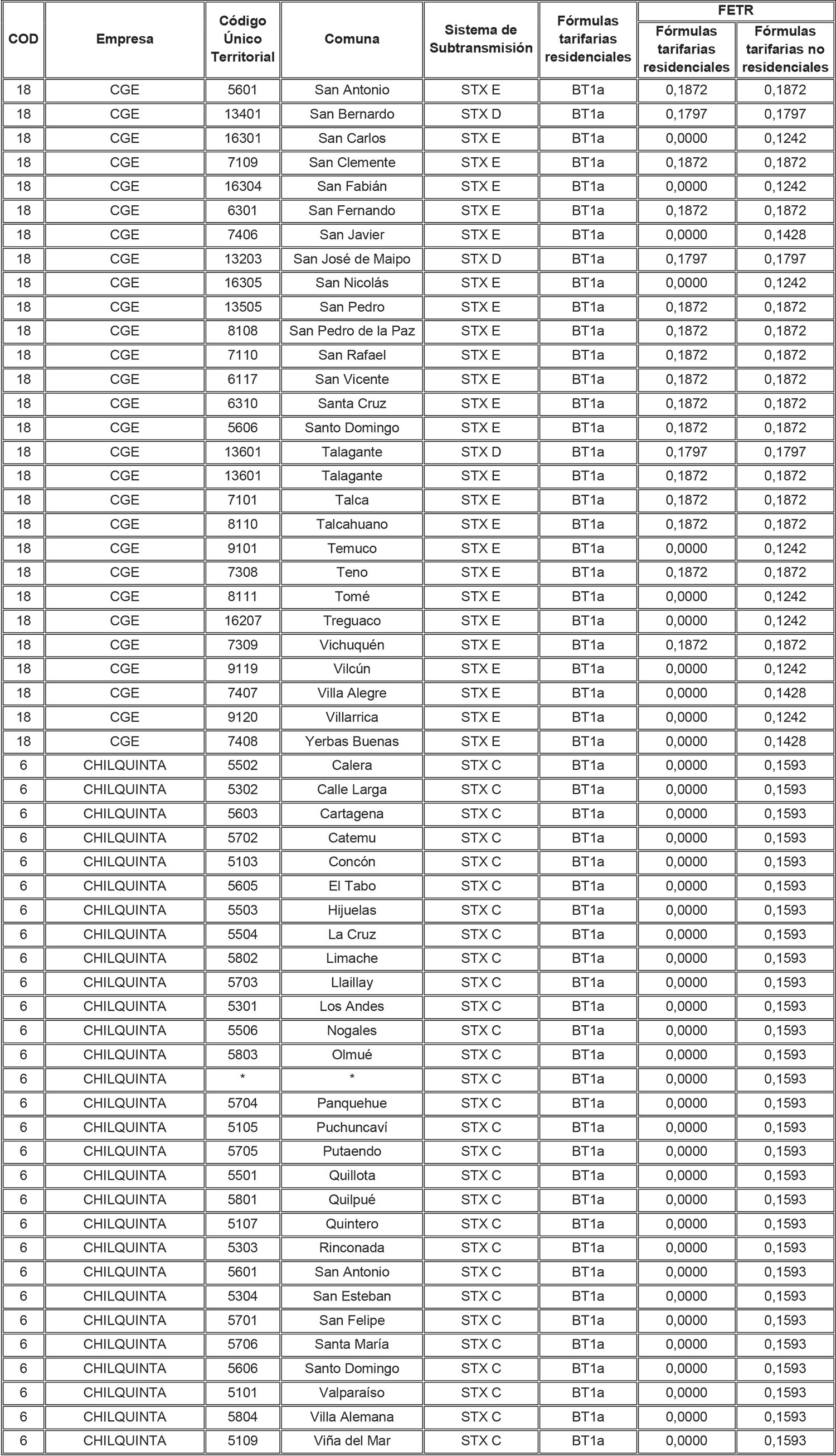 Para aquellas combinaciones empresa/comuna/sistema de transmisión zonal que no tienen asignado en la tabla anterior un FETR para alguna de las tarifas residenciales, se deberá aplicar el FETR determinado para la combinación empresa/sistema de transmisión zonal/tarifa, determinado para aquellas comunas no individualizadas (es decir, que presentan un * en la columna Comuna de la tabla anterior).