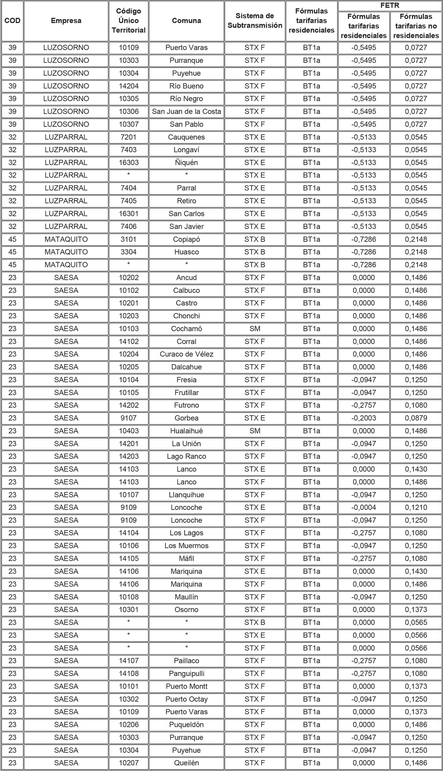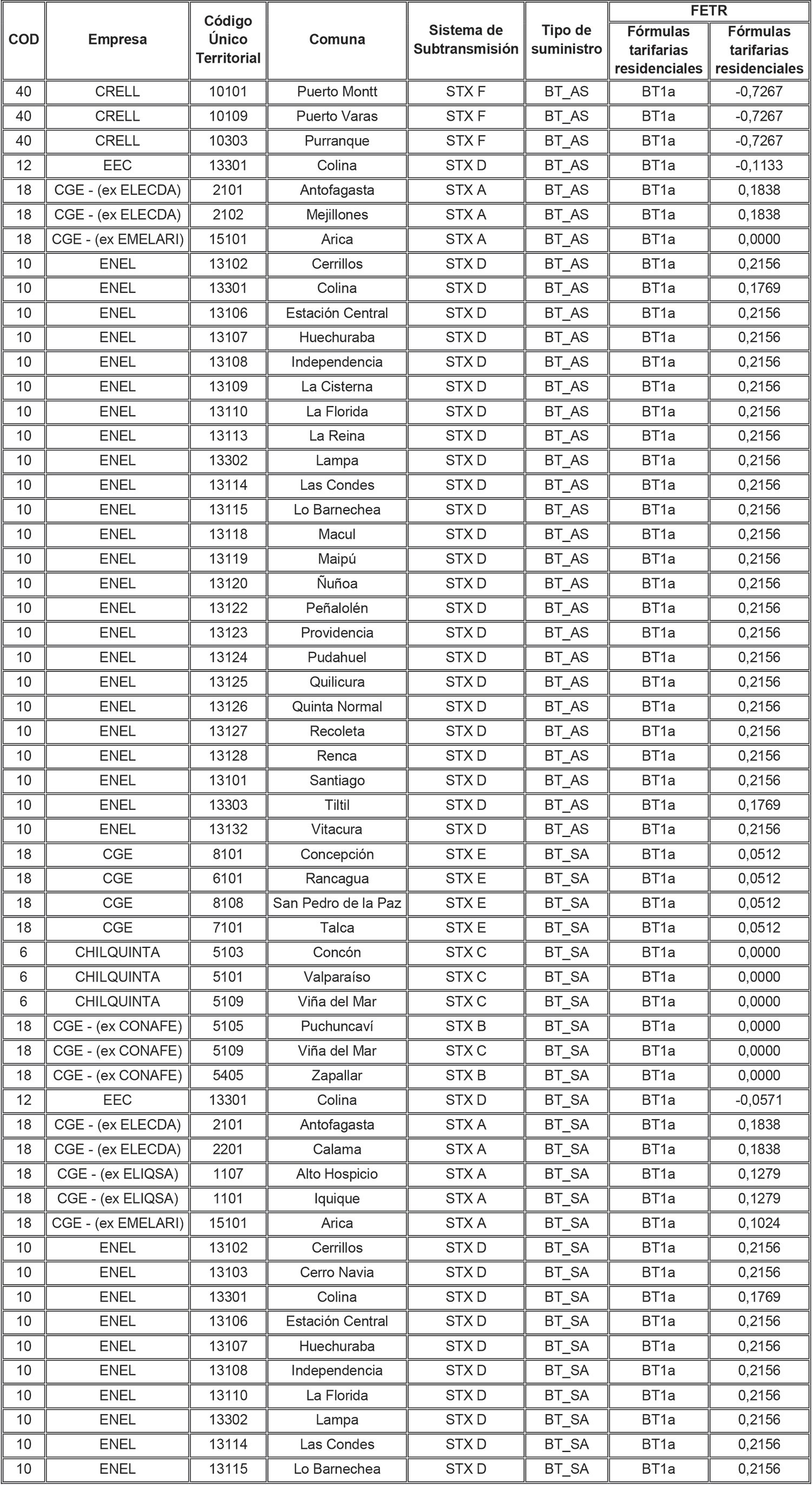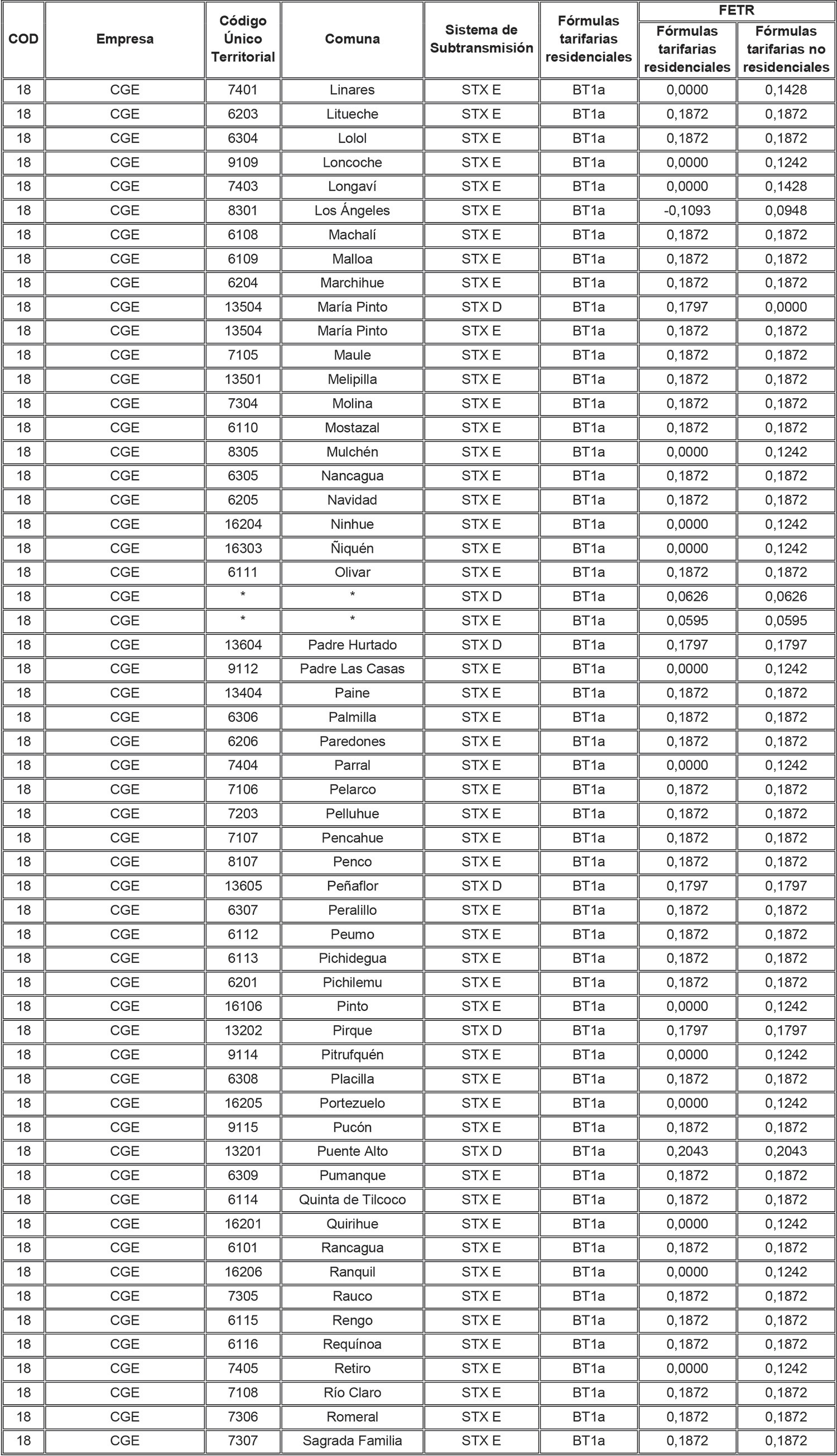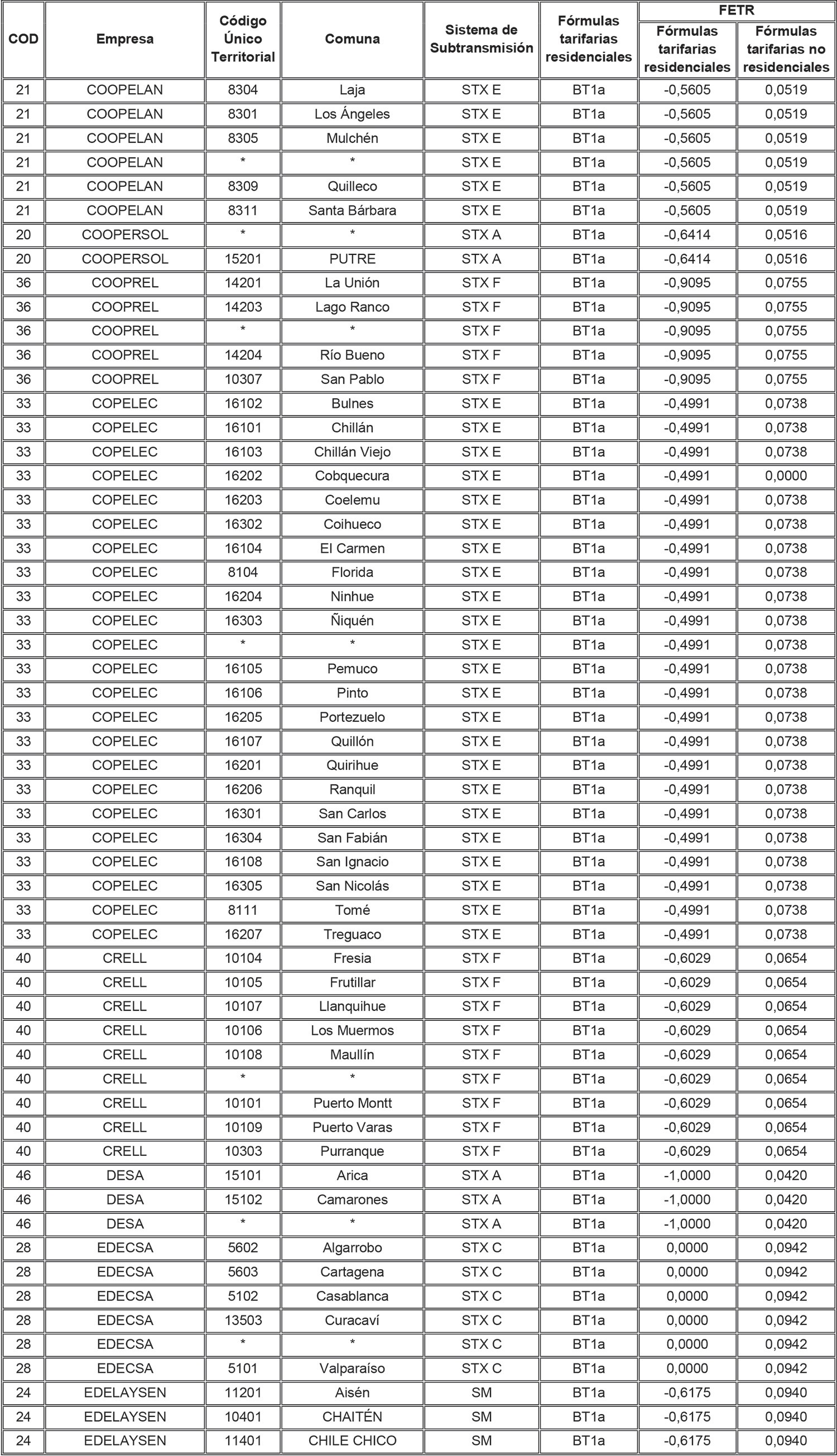 Para aquellas combinaciones empresa/comuna/sistema de transmisión zonal que no tienen asignado en la tabla anterior un FETR para alguna de las tarifas residenciales, se deberá aplicar el FETR determinado para la combinación empresa/sistema de transmisión zonal/tarifa, determinado para aquellas comunas no individualizadas (es decir, que presentan un * en la columna Comuna de la tabla anterior).