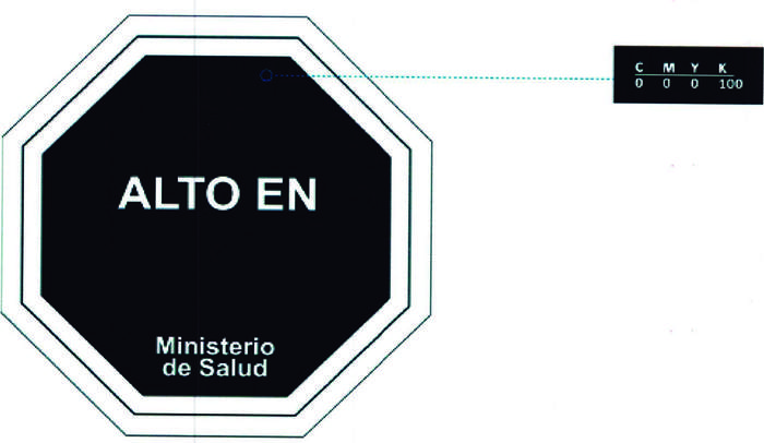 8) Las dimensiones mínimas del símbolo "ALTO EN" deberán ser de 3,5 cm de ancho y 3,5 cm de alto. El símbolo "ALTO EN" será una figura octagonal de fondo color negro y doble borde blanco, y en su interior el texto "ALTO EN" en letras mayúsculas y de color blanco. Además, en el mismo símbolo deberá inscribirse la frase "Ministerio de Salud", tal como se indica en el diagrama 3.