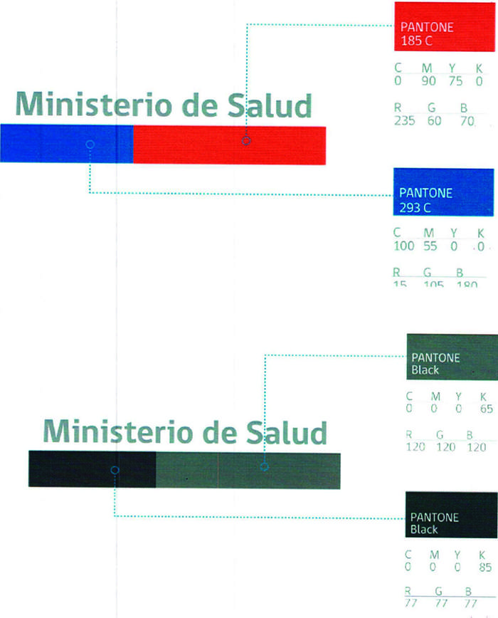 9) El complemento de gobierno es el isologo del gobierno, cuya función es ser una referencia que remarque el carácter gubernamental de la pieza gráfica en que se aplica, el que siempre irá dispuesto en el inferior de la franja negra del anuncio, y estará constituido por franjas en colores azul y rojo, excepto en el caso de anuncios impresos en blanco y negro, en el cual irá en versión pluma negativo (blanco) tal como indica el diagrama 4. El complemento de gobierno irá acompañado de la firma "Ministerio de Salud" en tipografía gobCL, específicamente en su versión Bold, según indica el diagrama 5.