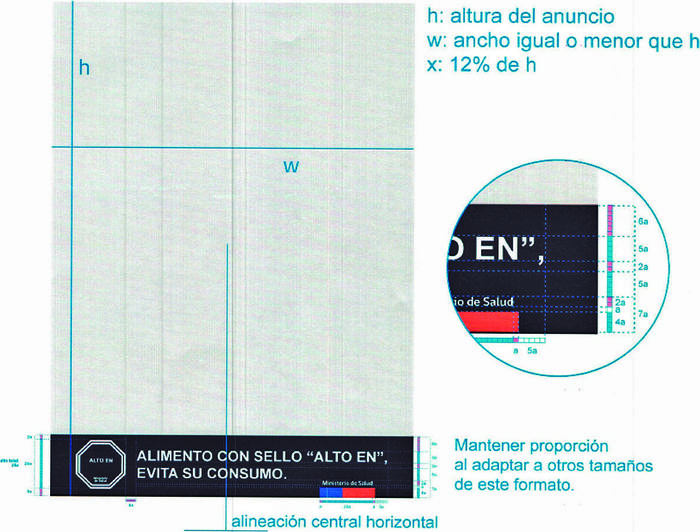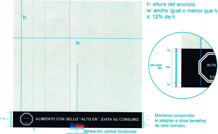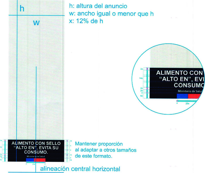 c) Los anuncios verticales en prensa podrán no incluir el símbolo "ALTO EN" cuando sus dimensiones no lo permitan. En este caso, el texto del Mensaje y el complemento deberán estar centrados en relación con la franja negra, y su alto (x) será de un 12% del alto total del anuncio (h), tal como indica el diagrama 8.