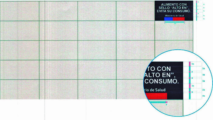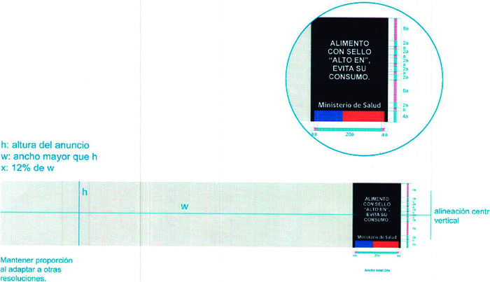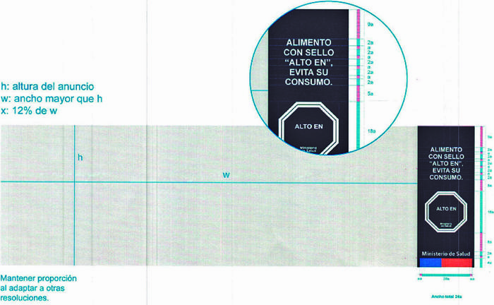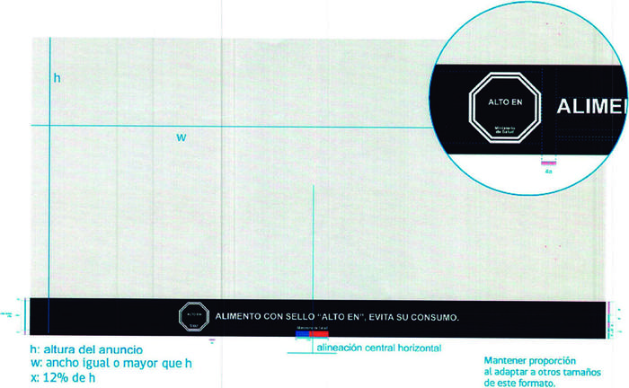 e) Los anuncios horizontales en prensa podrán no incluir el símbolo "ALTO EN" cuando sus dimensiones no lo permitan. En este caso, el Mensaje irá ubicado a la derecha del anuncio publicitario, visto desde el observador, y su ancho (x) será de un 12% del ancho total del anuncio (w). El texto del Mensaje y el complemento deberán ir centrados en relación a la franja negra, tal como señala el diagrama 10.