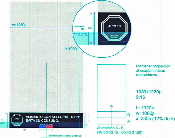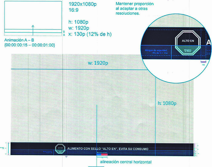f) Para el caso de los anuncios publicitarios audiovisuales en medios como la televisión, pantallas o monitores en medios de transporte con un sistema de avisaje, cine, monitores en vía pública y otros semejantes, será obligatoria la aplicación del Mensaje en los spots (tanto en tandas comerciales como dentro de los programas), cápsulas, mención comercial, cortina, y otros similares, y deberá estar siempre presente durante toda la exhibición de dicha publicidad. Para asegurar la legibilidad del Mensaje, se considera un margen de seguridad de 5% para la disposición del Mensaje. El margen de seguridad es el área mínima de la composición del Mensaje, ubicada en sus extremos u orillas, que debe permanecer libre de información y elementos de diseño, con el objetivo de resaltar la información central y que ésta sea visible en cualquier dispositivo o soporte en el cual se presente.