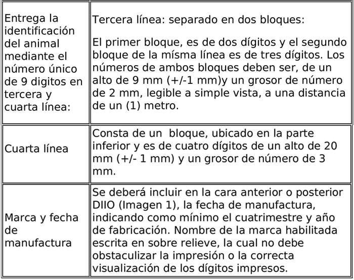 3. Las especificaciones técnicas generales que deben cumplir los DIIO para las distintas especies y los otros métodos de identificación, son las siguientes: