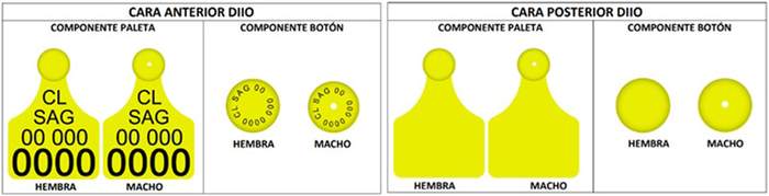 D.O. 03.07.2025de los componentes debe contar con la siguiente información impresa: se debe incorporar en una de las piezas (macho o hembra) la identificación del país con la sigla CL, además de la identificación del Servicio Agrícola y Ganadero mediante la sigla SAG y la numeración única de 9 dígitos. En el otro componente se incorpora solo la identificación del animal mediante el número único de 9 dígitos, esta numeración visual debe replicarse en el componente electrónico, que contendrá un chip con radiofrecuencia (RFID), cuya codificación de RFID debe ser de 15 dígitos, correspondiendo los últimos 9 dígitos al número oficial asignado por el Servicio. Este componente RFID podrá encontrarse en el componente macho o hembra.