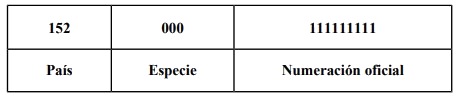 D.O. 03.07.2025codificación de RFID será de 15 dígitos y corresponderá a la siguiente estructura: Los tres primeros dígitos de la numeración 152 correspondiente a Chile, tres siguientes dígitos 0 que identificará la especie y se finalizará con la numeración asignada por el Servicio, como se indica a continuación: