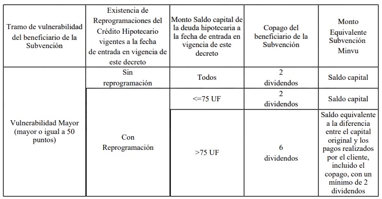 D.O. 26.08.2025Los deudores hipotecarios que, a raíz de la evaluación realizada conforme a los artículos anteriores, obtengan puntaje mayor o igual a 50 puntos, podrán acceder al pago de la subvención estatal a que se refiere el artículo 1º del presente decreto, previo copago, a objeto de obtener con ello la extinción total de la deuda hipotecaria que mantiene con el Banco del Estado de Chile. Este copago se establecerá en un número definido de dividendos, establecidos según tramos de deuda y la existencia de reprogramaciones, conforme se indica en la siguiente tabla: