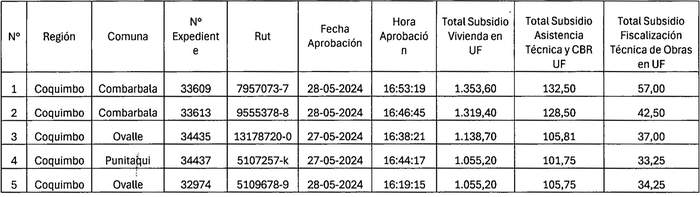 1. Apruébase la nómina correspondiente a un total de 5 familias que han sido seleccionadas para el otorgamiento de subsidios habitacionales del Programa de Habitabilidad Rural en su título II regulado por el DS Nº 10 (V. y U.), de 2015, correspondientes al Llamado a Postulación en Condiciones Especiales de 2024, citado en el visto d) de la presente resolución, la que se adjunta a la presente resolución y se entenderá como parte integrante de ésta. Además, fíjase el número de postulantes seleccionados por región, según el siguiente detalle: