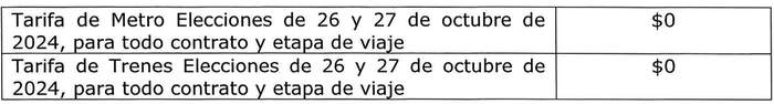 2° Instrúyase, a los correspondientes prestadores de servicios complementarios, la implementación de la modificación de estructura tarifaria que por este acto se ordena, para ser aplicada los días 26 y 27 de octubre del presente año en Metro de Santiago y en el tramo Nos-Estación Central del servicio de trenes operado por EFE Central S.A.