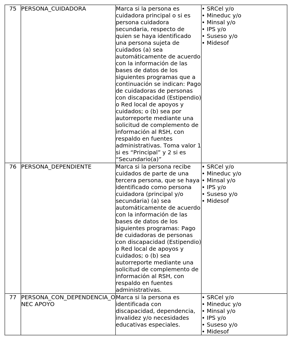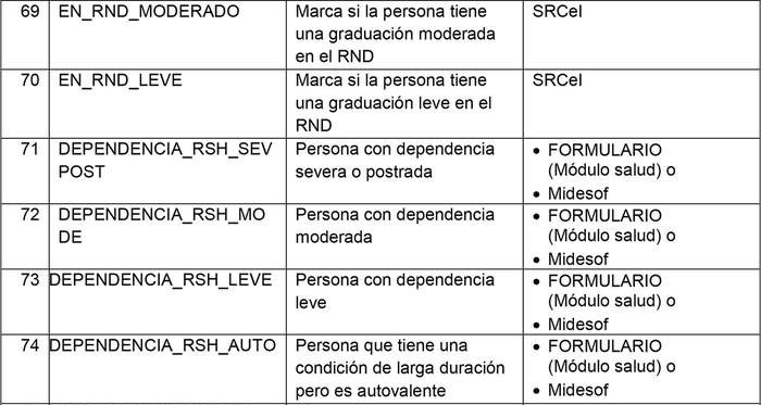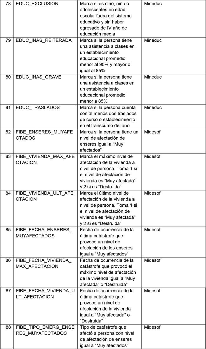 Corresponde a los siguientes datos que son determinados, construidos o inferidos a partir del tratamiento de la información contenida en el Registro de Información Social, y de la información autorreportada por las personas que integran hogares incorporados al Registro Social de Hogares, a través de cómputos o codificaciones realizadas por la plataforma del artículo 55 del reglamento aprobado por el decreto supremo N° 22 de 2015, u obtenidos desde fuentes administrativas o secundarias: