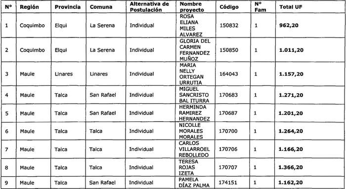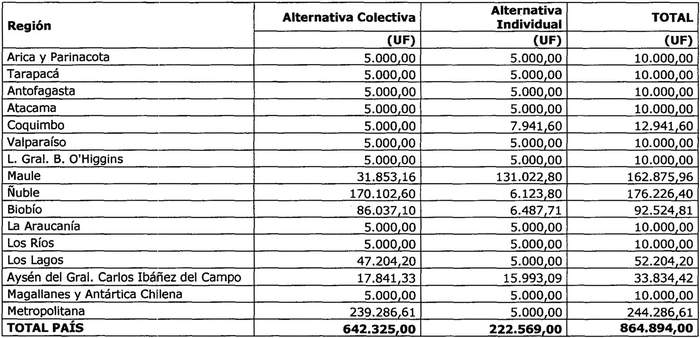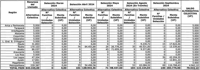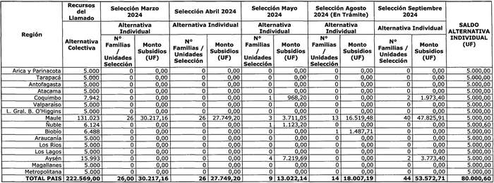 4. Los proyectos seleccionados en el llamado dispuesto en la resolución exenta Nº 324, correspondientes a los señalados en el Resuelvo 2., determinan un saldo que se resume en el siguiente cuadro para cada región del país, incluyendo la suma total de familias beneficiadas y Unidades de Fomento comprometidas, considerando los montos de subsidio de los proyectos, incluidos sus respectivos servicios de asistencia técnica y fiscalización técnica de obras, según alternativa de postulación: