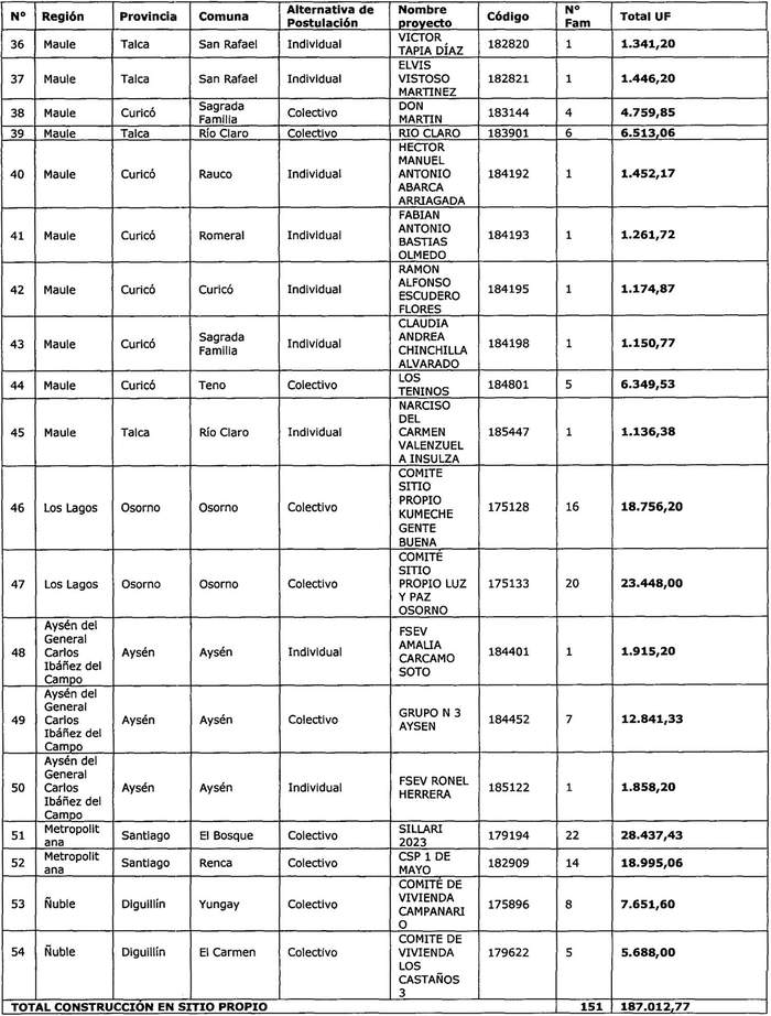 2. Apruébase la siguiente nómina de proyectos calificados al 30 de mayo de 2024, seleccionados para el otorgamiento de subsidios del Programa Habitacional Fondo Solidario de Elección de Vivienda, con su respectivo financiamiento total, incluyendo los servicios de asistencia técnica y fiscalización técnica de obras, correspondientes a 54 proyectos en la modalidad de Construcción en Sitio Propio, 44 de ellos postulados de manera individual en las regiones de Coquimbo, Maule, y Aysén del Gral. Carlos Ibáñez del Campo, y 10 postulados de manera colectiva en las regiones de Maule, Los Lagos, Aysén del Gral. Carlos Ibáñez del Campo, Metropolitana y Ñuble, además de 2 proyectos en la tipología Pequeño Condominio, postulados de manera colectiva en la Región Metropolitana, todos correspondientes al proceso de selección del llamado efectuado por resolución exenta Nº 324 (V. y U.), de 2024: