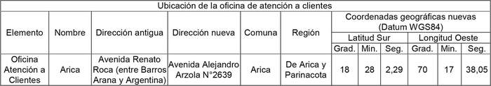 6. Autorízase a la concesionaria a modificar dirección y coordenadas geográficas de la oficina de atención a clientes, según se indica a continuación: