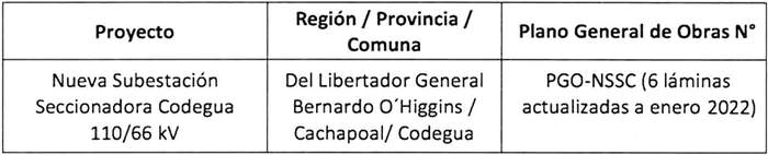Nueva Subestación Seccionadora Codegua 110/66 kV: Corresponde a una subestación de tipo seccionadora, la cual tendrá configuración de barra principal seccionada más barra de transferencia en el patio 110 kV, y un esquema de barra principal más barra de transferencia en el patio de 66 kV, con capacidad de transformación de tensión eléctrica 110/66 kV con una potencia de 100 MVA para el transformador proyectado. La superficie por la cual se solicita concesión eléctrica definitiva y servidumbre eléctrica es de 20.056 m², los cuales son necesarios para materializar las instalaciones de la Nueva Subestación Seccionadora Codegua 110/66 kV.
