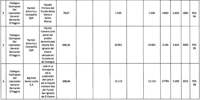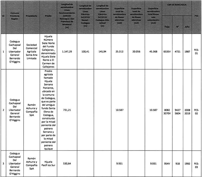 Artículo 7°.- Constitúyanse, de acuerdo con lo establecido en la Ley General de Servicios Eléctricos, las servidumbres para el establecimiento del proyecto "Nueva Subestación Seccionadora Codegua 110/66 kV" en los predios particulares que se indican a continuación: