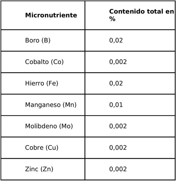. Si un sustrato ha sido enriquecido con exclusivamente un micronutriente, este se encontrará en un contenido igual o superior a 2 % en masa. Si contiene exclusivamente más de un micronutriente, el contenido mínimo con el que deberá cumplir el producto se obtendrá a partir de la suma de todos los contenidos en porcentaje de los micronutrientes que lo conforman y corresponderá a un valor no inferior al 2 %. Si cumplen con estos contenidos mínimos estos nutrientes podrán ser declarados en etiqueta o folleto del producto.