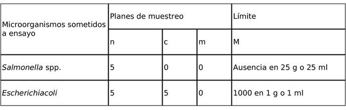 v. Escherichia coli y Salmonella spp. no estarán presentes en una concentración superior a los límites indicados en el siguiente cuadro para ser considerados ausentes: