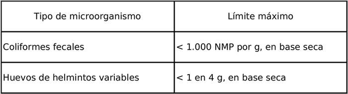 vi. Coliformes fecales y huevos de helmintos no estarán presentes en una concentración superior a los límites indicados en el siguiente cuadro: