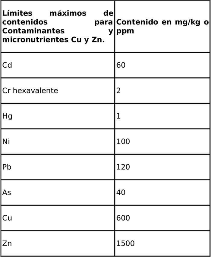 iii. Los límites máximos de metales pesados y los límites máximos de Cu y Zn, serán los que se indican a continuación: