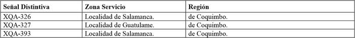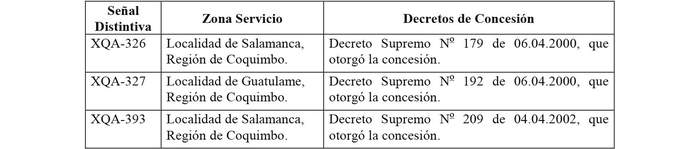 f) Los decretos supremos del Ministerio de Transportes y Telecomunicaciones que otorgaron las concesiones y cuyo actual titular es Sociedad Radiodifusora El Choapa Limitada, que se indican a continuación: