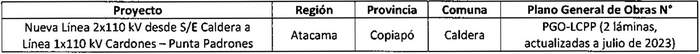 El Proyecto considera un doble circuito con un conductor por fase en tensión 110 kV, de categoría Alta Tensión, que seccionará la Línea lx110 kV Cardones - Punta Padrones y se conectará a la Ampliación en S/E Caldera. Esta Línea tiene una potencia máxima de transporte de 95 MVA y tiene una longitud total de 2.037,00 metros desde el vértice V1 correspondiente a la estructura 1, hasta el marco de línea ML ubicado al interior de la Ampliación en S/E Caldera.