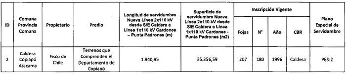 La longitud del Proyecto cuya concesión se otorga por el presente decreto, es de 2.015,53 metros, comenzando su trazado en el vértice V1, ubicado en la estructura 1, en las coordenadas Este [m] 319.288,73 y Norte [m] 7.002.180,02, y finalizando en el punto PF, ubicado en el límite de la Ampliación en S/E Caldera, en las coordenadas Este [m] 321.240,94 y Norte [m] 7.002.436,28. Ambos puntos mencionados se encuentran dibujados en el Plano General de Obras PGO-LCPP, el cual está compuesto de 2 láminas, y corresponden al sistema de Coordenadas UTM WGS 84 del Huso 19S. La longitud de servidumbre eléctrica que se solicita es de 2.001,40 metros, comenzando en el vértice V1 y terminando en el punto PF, ya indicados anteriormente, exceptuando dos Bienes Nacionales de Uso Público.