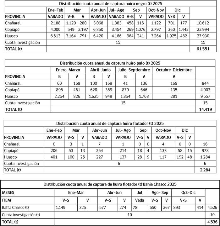 Por resolución exenta N° 2.866/2024, de esta Subsecretaría, establézcase la distribución de la cuota de captura de los recursos Huiro negro, Huiro palo y Huiro flotador, en el área marítima de la Región de Atacama para el año 2025, establecida mediante decreto exento Folio DEXE202400194, de 2024, del Ministerio de Economía, Fomento y Turismo, la que será en la forma que a continuación se indica: