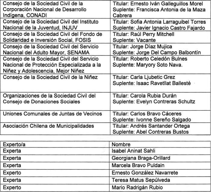 1º Apruébase la constitución del Consejo de la Sociedad Civil del año 2024-2025, del Ministerio de Desarrollo Social y Familia, el cual está conformado por los consejeros y consejeras que se indican a continuación: