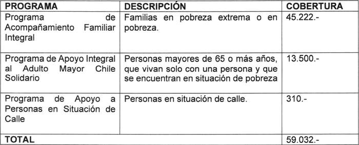 3° Que, en este contexto, el Jefe de la División de Promoción y Protección Social (S), dependiente de la Subsecretaría de Servicios Sociales, solicitó a través de memorándum electrónico SSS N° 5893/2024 (Exp. 100339/2024), del 23 de octubre de 2024, la elaboración del presente acto administrativo que identifica la cobertura año 2024 para nuevos usuarios del Subsistema "Seguridades y Oportunidades", de los Programas de Acompañamiento Familiar Integral, de Apoyo Integra al Adulto Mayor y de Apoyo a Personas en Situación de Calle, atendida la disponibilidad de recursos establecida en la ley N° 21.640 de Presupuestos del Sector Público vigente para el año 2024; por tanto,