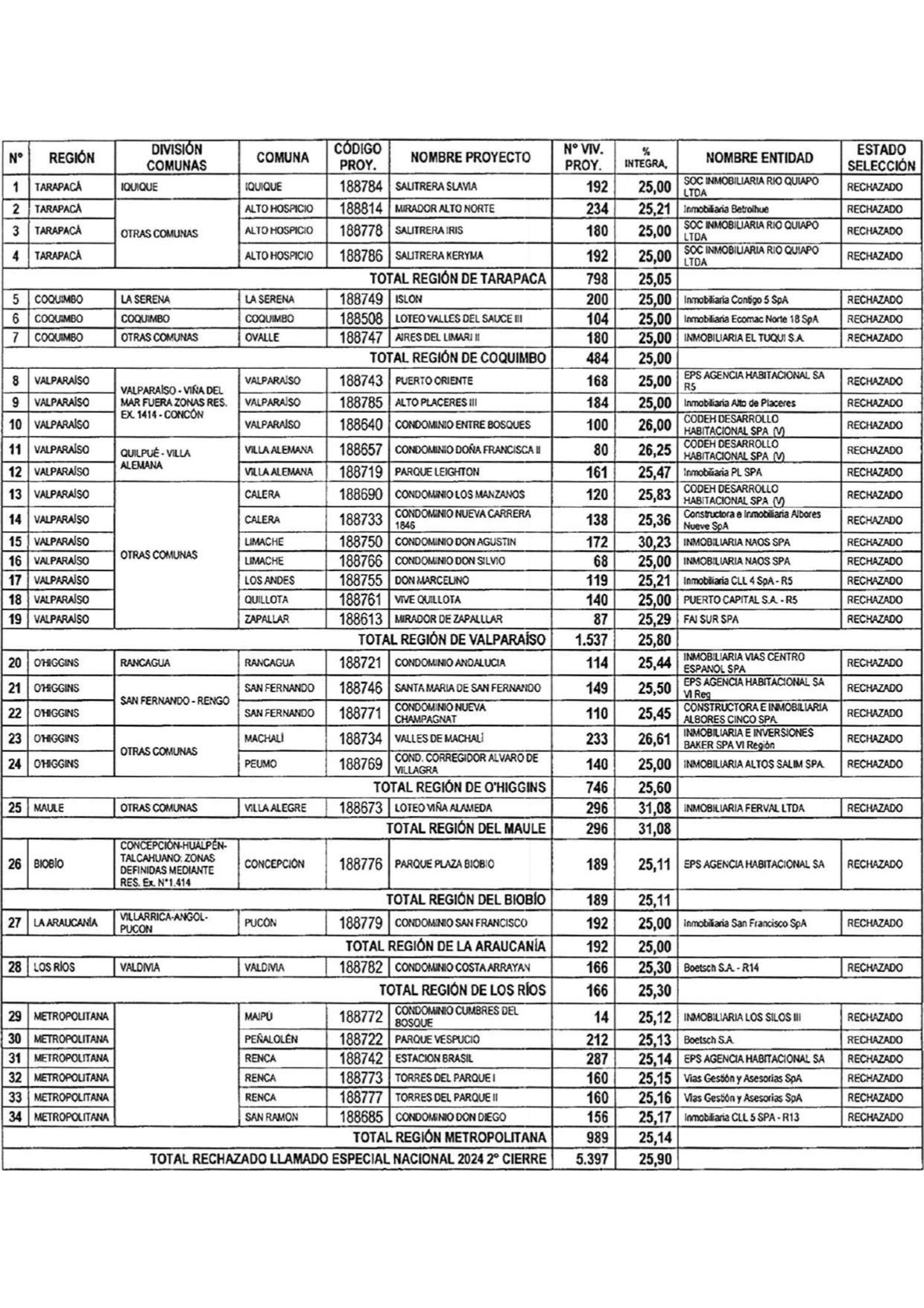 6. Las nóminas de los 30 proyectos elegibles que se encuentran seleccionados, y de los 33 proyectos rechazados, serán publicadas en la página web del Ministerio de Vivienda y Urbanismo www.minvu.cl, adicionalmente una vez publicada la presente resolución en el Diario Oficial, cada Serviu deberá remitir, mediante correo electrónico, a las Entidades Desarrolladoras correspondientes, las actas de todos sus proyectos que hayan resultado rechazados.