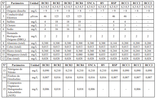 36. Que, tal como se indica en el informe técnico de la elaboración del proyecto definitivo de las presentes normas, los parámetros y áreas de vigilancia a ser recuperados respecto de la calidad actual de las aguas corresponden a: a) pH en el área de vigilancia RCR4; b) Oxígeno disuelto en las áreas de vigilancia RCR1, RCR2, RCR4, RSP y RCC2; c) Conductividad eléctrica en las áreas de vigilancia RCR3 y RCR4; d) Sulfato en el área de vigilancia RCR2; e) Cloruro en las áreas de vigilancia RCR2, RCR3 y RCR4; f) Sodio en las áreas de vigilancia RCR2, RCR3 y RCR4; g) Aluminio total en las áreas de vigilancia SNCA y RCC3; h) Hierro total en las áreas de vigilancia RCR1, RCR2, RCR3 y SNCA; i) Zinc total en el área de vigilancia SNCA; j) Nitrógeno de nitrato en las áreas de vigilancia RCR1 y RCR3; k) Fósforo de Ortofosfato en las áreas de vigilancia RCR1 y RCC2; y, d) Compuestos Orgánicos Halogenados Adsorbibles (AOX) en las áreas de vigilancia RCR1, RCR2, RCR4 y SNCA.