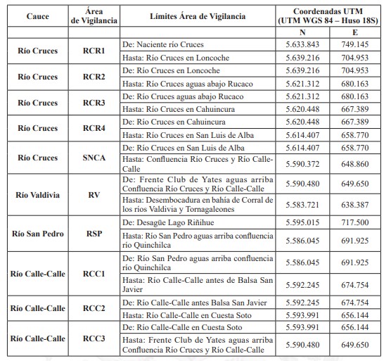 Artículo 4°.- Áreas de Vigilancia. Para efectos del cumplimiento y fiscalización de las presentes normas, se han establecido para la cuenca del río Valdivia diez áreas de vigilancia. La delimitación y ubicación de cada una de las áreas de vigilancia se establecen en la tabla N° 1.