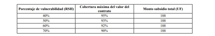 D.O. 30.07.2025 El porcentaje de cobertura del subsidio destinado a cada beneficiado se definirá conforme al porcentaje de vulnerabilidad indicado en su Registro Social de Hogares, acreditado al postular. En consecuencia, los porcentajes de cobertura máxima de los subsidios que se otorgarán son los definidos en la siguiente tabla: