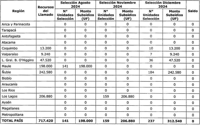 4. Los recursos comprometidos en el resuelvo 2 de la presente resolución, para los proyectos seleccionados en este último cierre, así como las selecciones de todo el proceso del llamado dispuesto por resolución exenta Nº 320 (V. y U.), de 2024, se resumen en el siguiente cuadro, incluyendo la suma total de familias beneficiadas y Unidades de Fomento comprometidas: