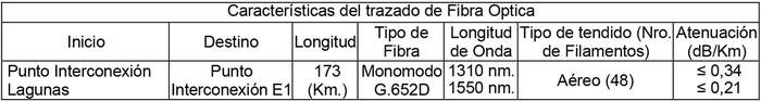 2. Un trazado de Fibra Óptica denominado Lagunas - Encuentro, cuyas características y ubicaciones se indican a continuación: