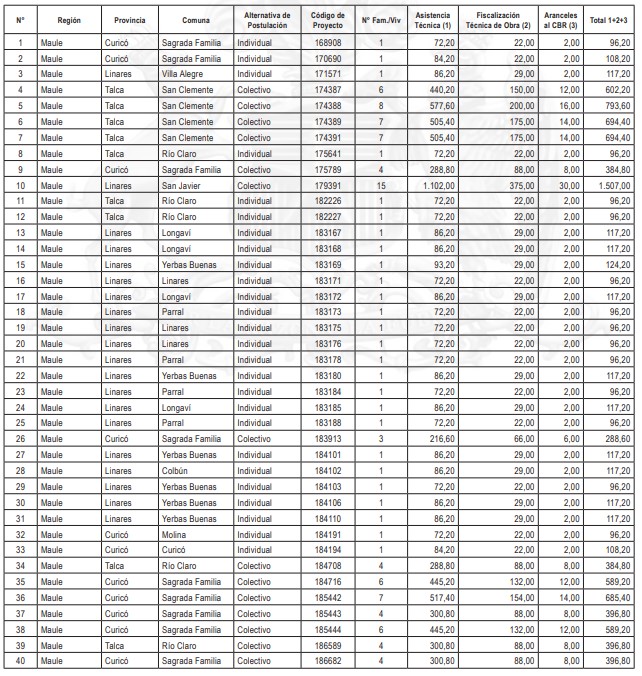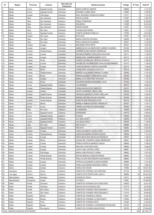 3. Apruébase la siguiente nómina de proyectos calificados al 17 de diciembre de 2024, seleccionados para el otorgamiento de subsidios del Programa Habitacional Fondo Solidario de Elección de Vivienda, con su respectivo financiamiento total, incluyendo los servicios de asistencia técnica y fiscalización técnica de obras, correspondientes a 66 proyectos en la modalidad de Construcción en Sitio Propio, 38 de ellos postulados de manera individual en la Región del Maule, y 28 postulados de manera colectiva en las regiones de Maule, Biobío, Araucanía, Los Lagos, RM, y Ñuble, además de 5 proyectos en la tipología Pequeño Condominio, postulado de manera colectiva en las regiones de Valparaíso, O'Higgins, Biobío y Metropolitana, todos correspondientes al proceso de selección del llamado efectuado por resolución exenta Nº 324 (V. y U.), de 2024: