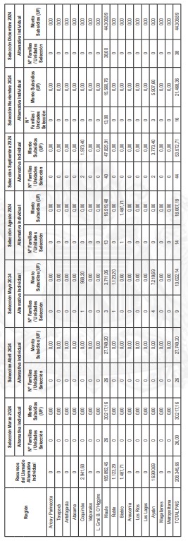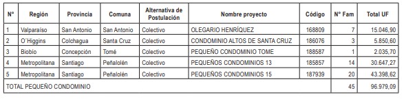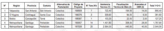 5. Los proyectos seleccionados en el llamado dispuesto en la resolución exenta Nº 324, correspondientes a los señalados en el resuelvo 3., determinan un saldo que se resume en el siguiente cuadro para cada región del país, incluyendo la suma total de familias beneficiadas y Unidades de Fomento comprometidas, considerando los montos de subsidio de los proyectos, incluidos sus respectivos servicios de asistencia técnica y fiscalización técnica de obras, según alternativa de postulación, además de los ajustes de montos y saldos realizados al proceso de selección, de la resolución citada en el visto d), en el resuelvo 1.: Resolución 699 EXENTA,