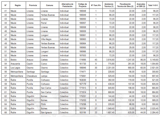 a. Reemplazar en la tabla inserta en su resuelvo 3., Construcción en Sitio Propio, su fila Nº 19, el valor "Total UF" para el proyecto Palafitos Paya, Código 175474, de 3.838,38 por 6.610,38, quedando la tabla actualizada de la siguiente forma: