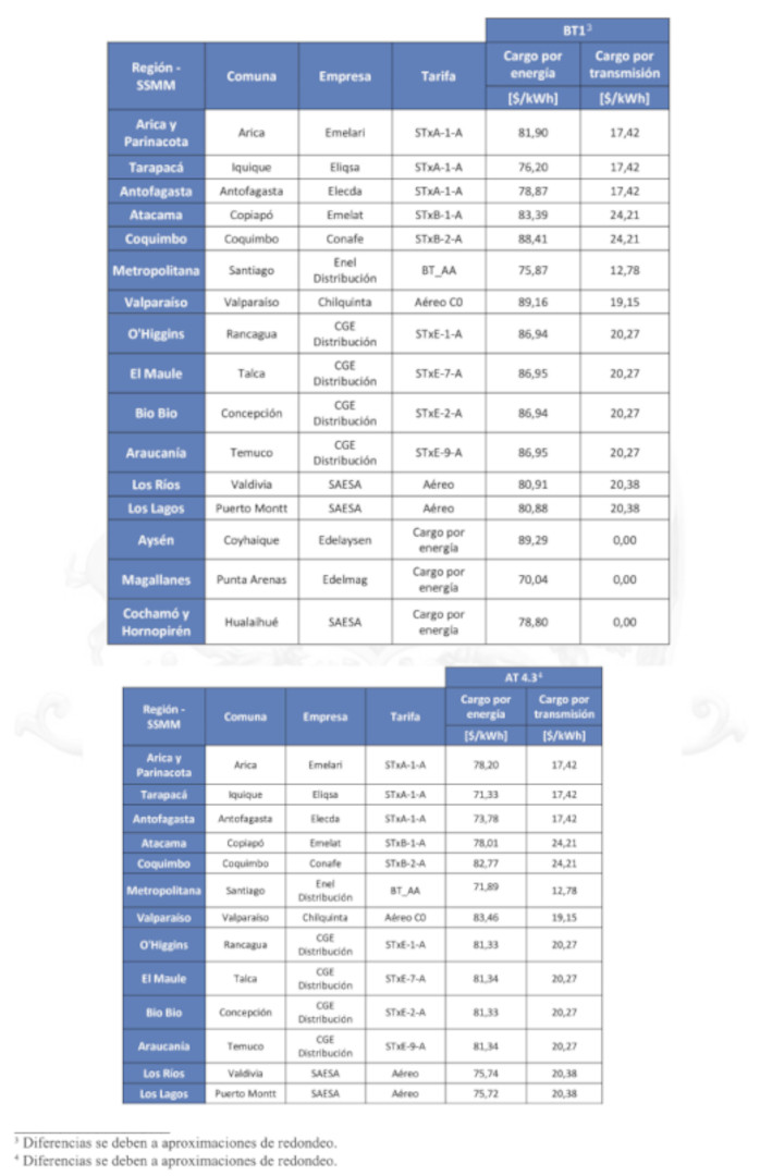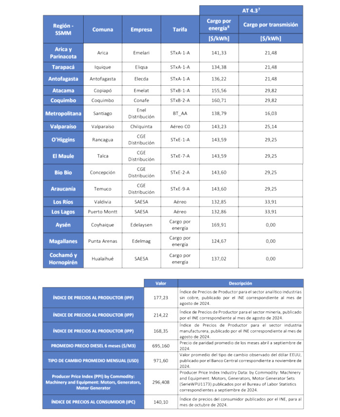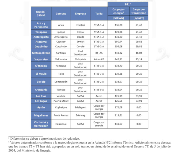 (8) Valores determinados conforme a la metodología expuesta en la Adenda Nº2 Informe Técnico. Adicionalmente, se destaca que los tramos T2 y T3 han sido agrupados en un solo tramo, en virtud de lo establecido en el Decreto 7T, de 5 de julio de 2024, del Ministerio de Energía.
