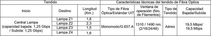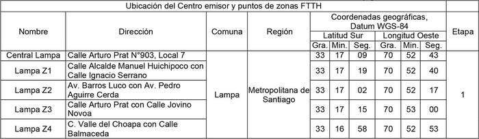 2. Autorízase a la concesionaria para instalar, operar y explotar un (1) Centro Emisor (Central Lampa) y tendido de Fibra Óptica para un sistema FTTH (Fiber to The Home), según se indica a continuación: