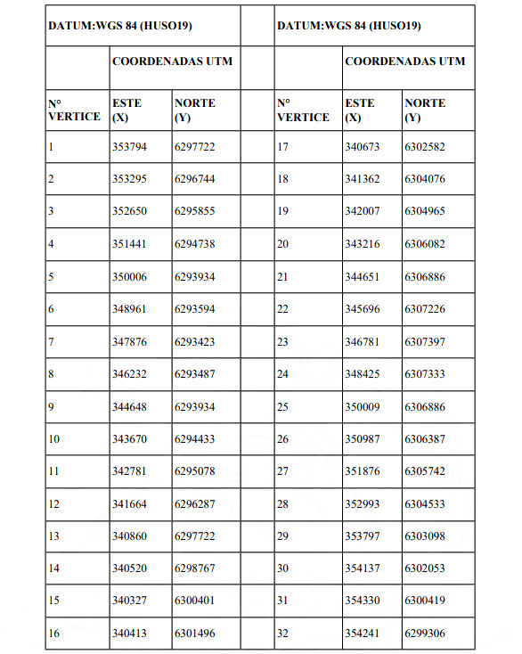 a) A partir de fecha 24 de febrero de 2025, como área reglamentada, el polígono de 32 vértices, determinado por las siguientes coordenadas UTM, señaladas a continuación: