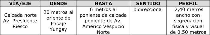 1. Apruébase el proyecto denominado: "Ciclovía Presidente Riesco", cuyo interesado es Navegante Américo Vespucio SpA, a emplazarse en la calzada norte de Av. Presidente Riesco, comuna de Las Condes, en el tramo, sentido y perfil que se indica en el siguiente cuadro: