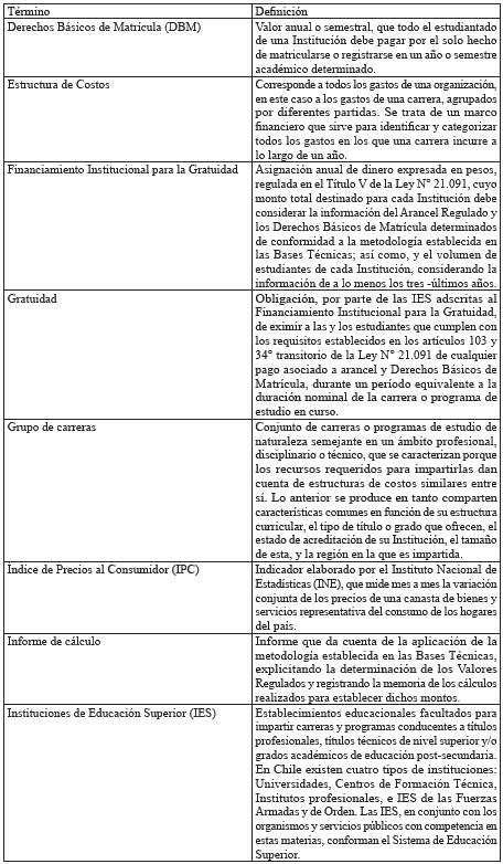 1°. Que, la Ley N° 21.091, sobre educación superior (en adelante e indistintamente, "Ley N° 21.091" o "Ley de Educación Superior"), regula en su título V el financiamiento institucional para la gratuidad, regulándose específicamente, en su párrafo 2°, los valores regulados de aranceles, derechos básicos de matrícula y cobros por concepto de titulación o graduación.