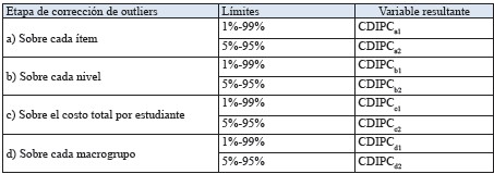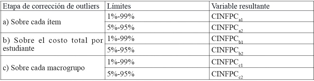 Tabla 8 - Variables de costos directos e indirectos por estudiante, según aplicaciones de procedimiento de corrección de outliers