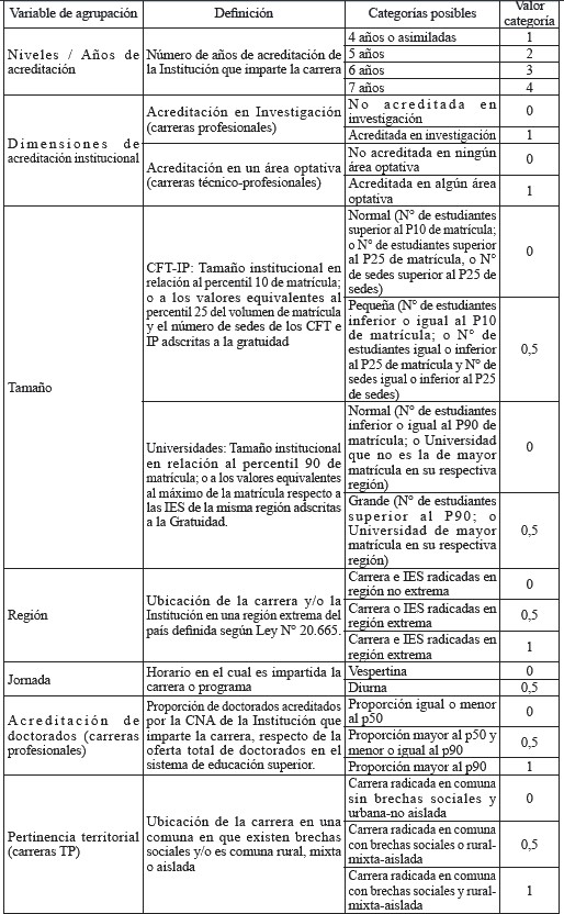II.9. Operacionalización de las variables: La Comisión valora el ajuste efectuado a la variable "tamaño institucional", señalando expresamente que "la justificación de esta variable, contenida en las páginas 45 y 46 de la segunda propuesta de bases técnicas, nos parece bien fundamentada, diferenciando el subsistema técnico-profesional el universitario", y añadiendo además que, tal como se comentó en la observación 3, "existen evidentes asimetrías con respecto entre ambos subsistemas, por lo que tal distinción es relevante" (énfasis agregado). Sin perjuicio de lo anterior, sugiere ajustes específicos a la Tabla que operacionaliza las variables para efectos del cálculo del preíndice de agrupación (contenida en la sección 3.3. de las Bases), en orden a unificar y precisar las definiciones de los percentiles y valores con respecto al tratamiento de cada subsistema.