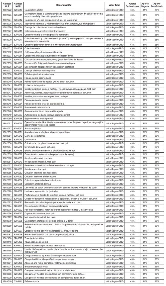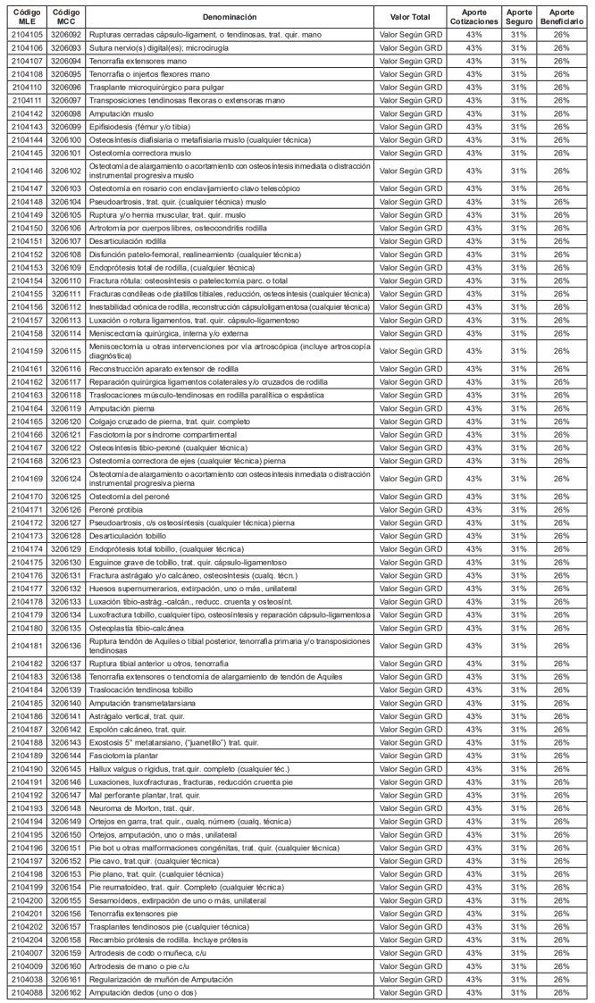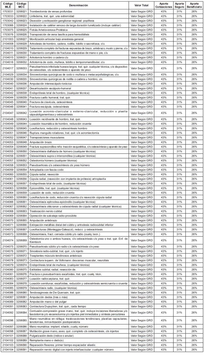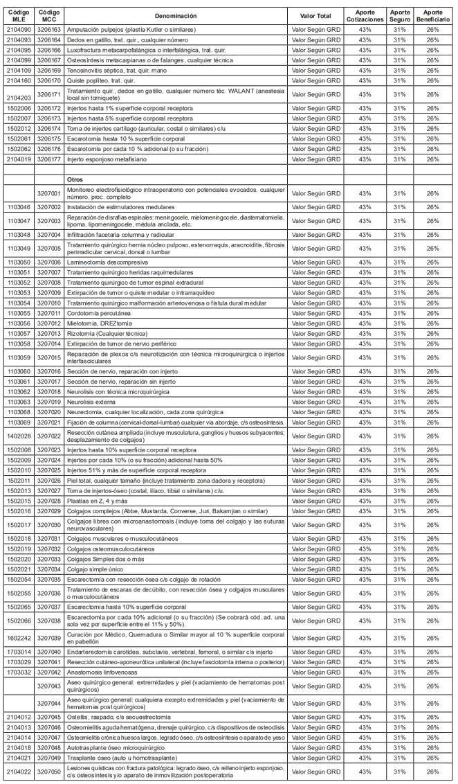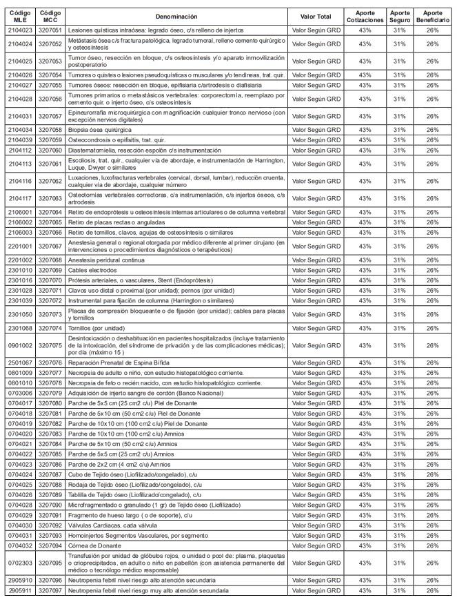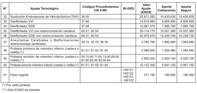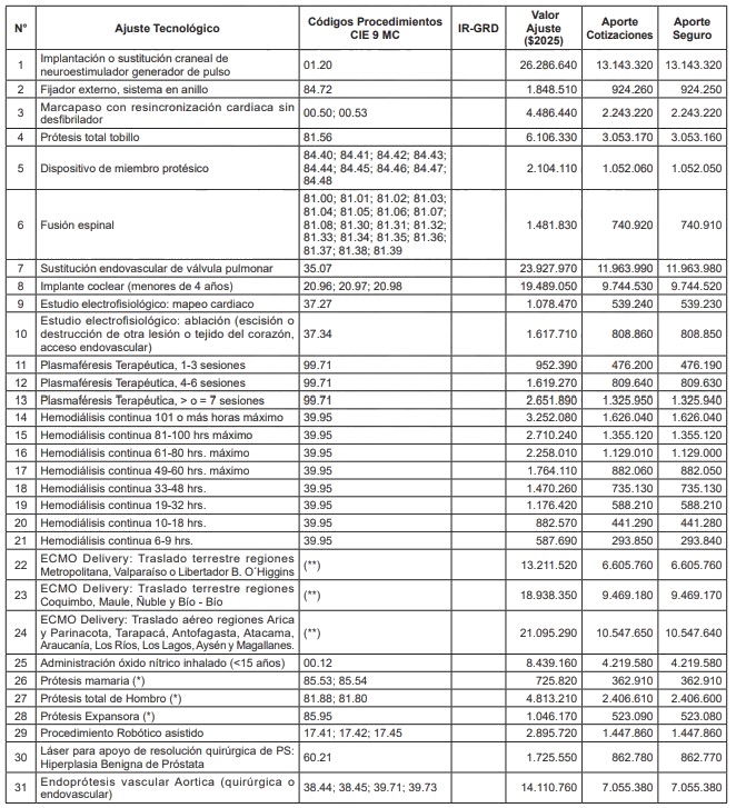D.O. 18.10.2025de Tecnología, que considera prestaciones, dispositivos, fármacos, prótesis o insumos que son parte de una intervención sanitaria y se pagan adicional al pago otorgado por el mecanismo de pago GRD y respecto de los procedimientos CIE9-MC definidos (Anexo III). El pago de estos ajustes será financiado en un 50% con Aporte Cotización (FAM) y, el otro 50% con Aporte Seguro.