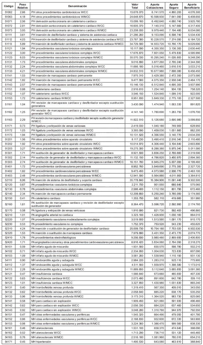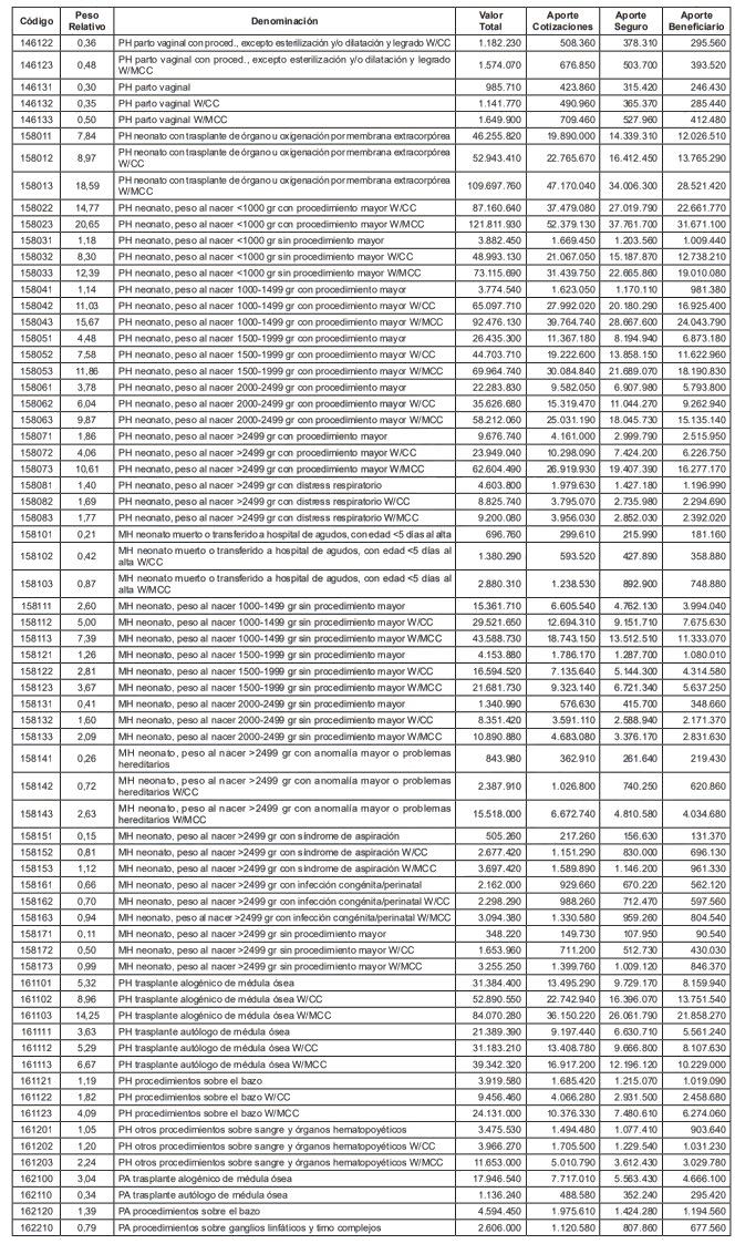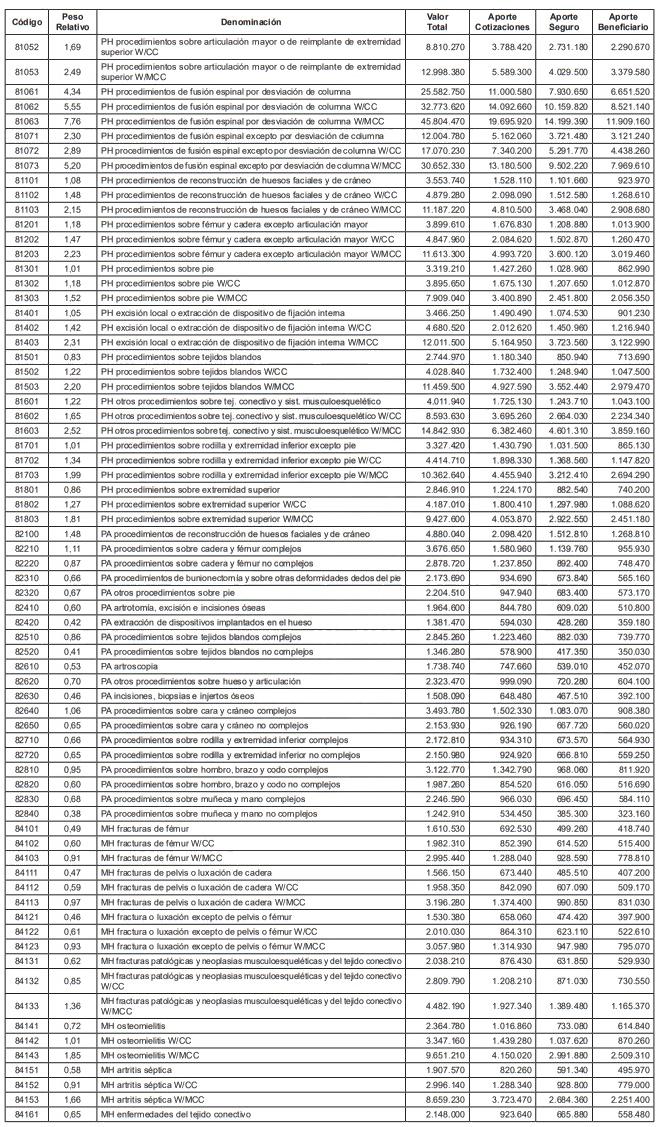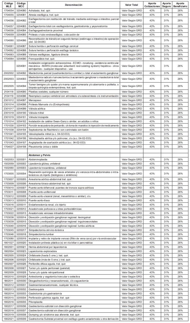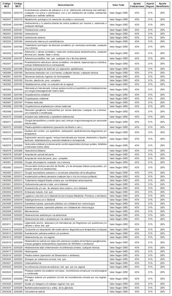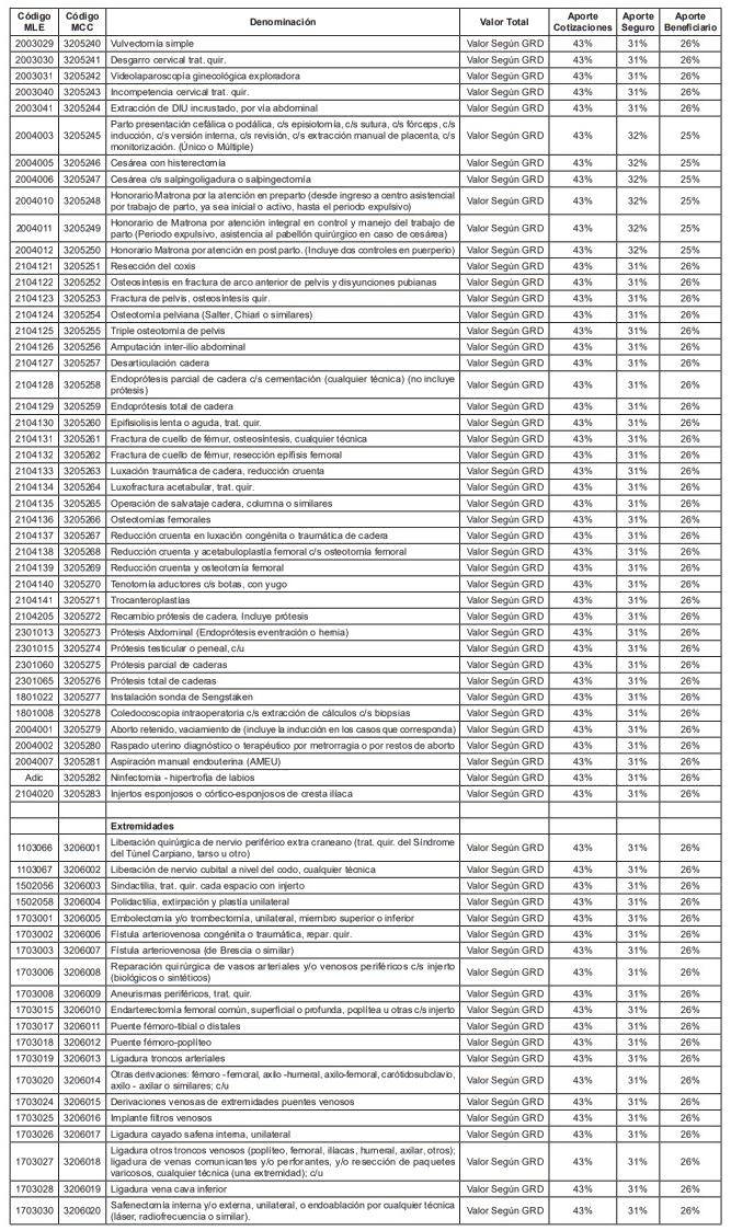 D.O. 18.10.2025de Tecnología, que considera prestaciones, dispositivos, fármacos, prótesis o insumos que son parte de una intervención sanitaria y se pagan adicional al pago otorgado por el mecanismo de pago GRD y respecto de los procedimientos CIE9-MC definidos (Anexo III). El pago de estos ajustes será financiado en un 50% con Aporte Cotización (FAM) y, el otro 50% con Aporte Seguro.
